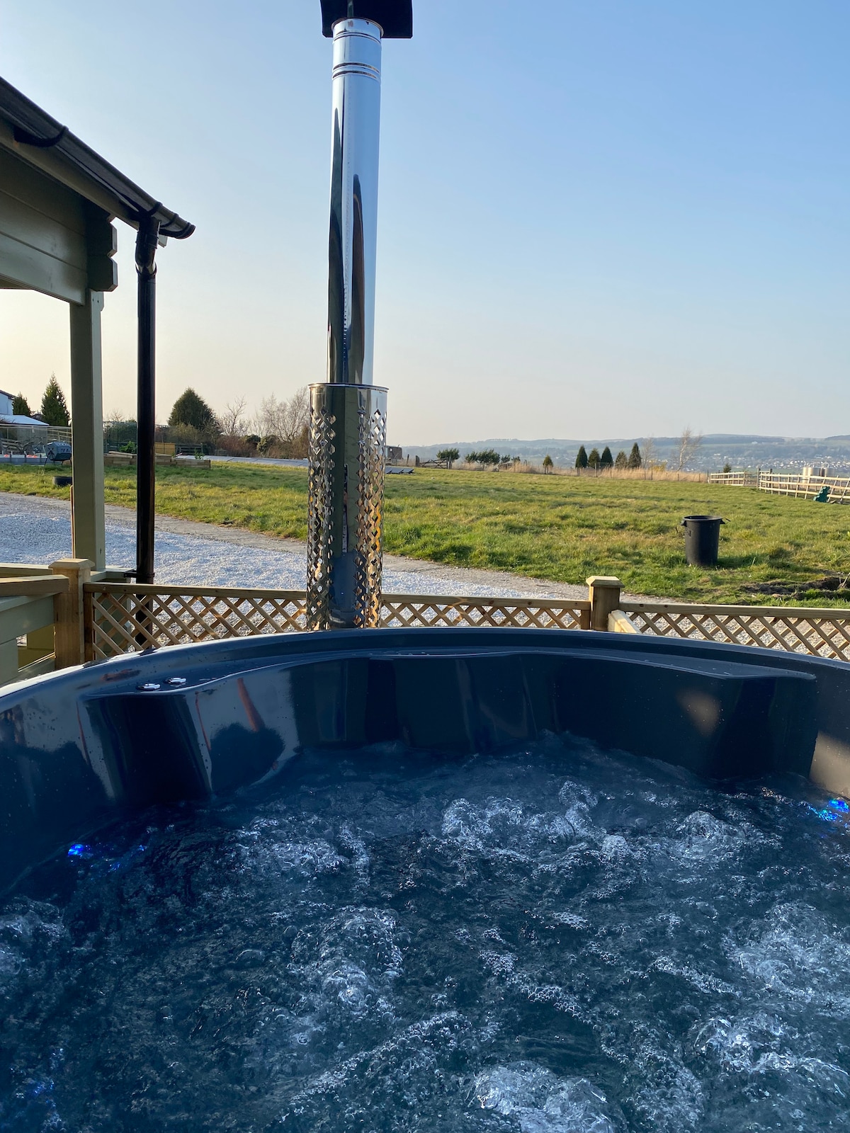 Cosy countryside lodge with wood-fired hot tub & bubbles. Sleeps 4,Optional private sauna hire available for a relaxing rural escape. There is Gas central heating which is on for three hours in the evening and 2 hours in the morning during the months of September 31st to March 31st. If heating is required afforestation that period there is an off grid charge of £30.00 A warm, peaceful lodge retreat perfect for romantic breaks, celebrations, walking holidays and seasonal getaways.