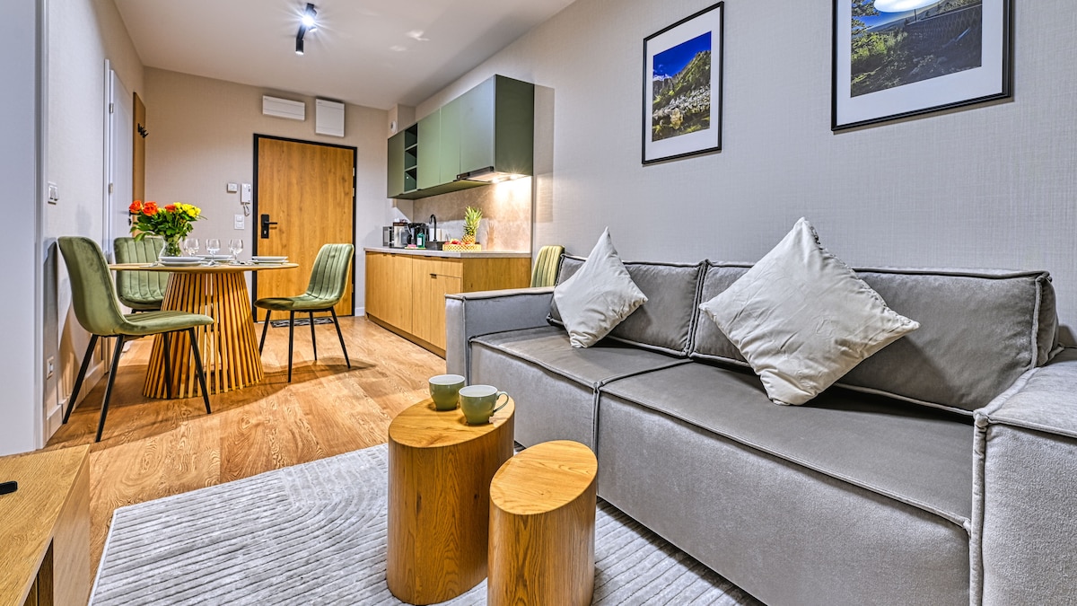 Vzdušný a prostorný apartmán uspokojí všechny vaše touhy po moderním ubytování s vlastním wellness až pro 4 osoby. Apartmán s king size manželskou postelí (180x200) a rozkládací sofou v obývacím pokojem až pro 2 osoby, kuchyňským koutem a terasou s vířivou vanou. Přímo z vířivky se pak můžete kochat panoramatickým výhledem na okolní hory. Co více si přát? Dejte si nohy na stůl a odpočiň si v tomto klidném, stylovém ubytování. Součástí budovy je i finská sauna.