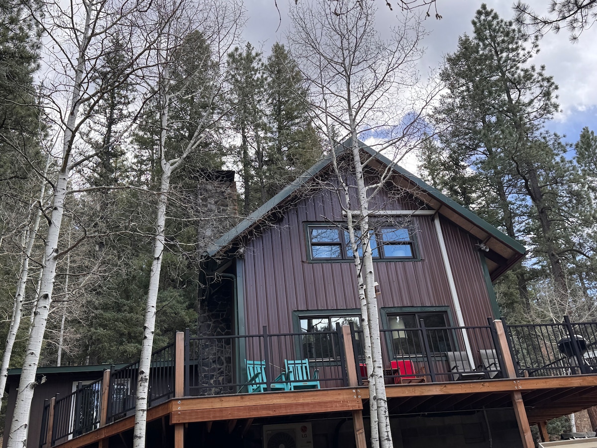 A northern New Mexico cabin and woodland retreat nestled on 10 acres in the santa fe national forest. 🌲♨️💤 The cabin is a perfect option for those who want access to Santa Fe and surrounding areas while also feeling refreshed from a memorable retreat in nature. The space has a fully equipped kitchen and has plenty of games, cards, books, etc. available to guests. The property is located on a county maintained road but 4wd is recommended in the event of big rains and snows.