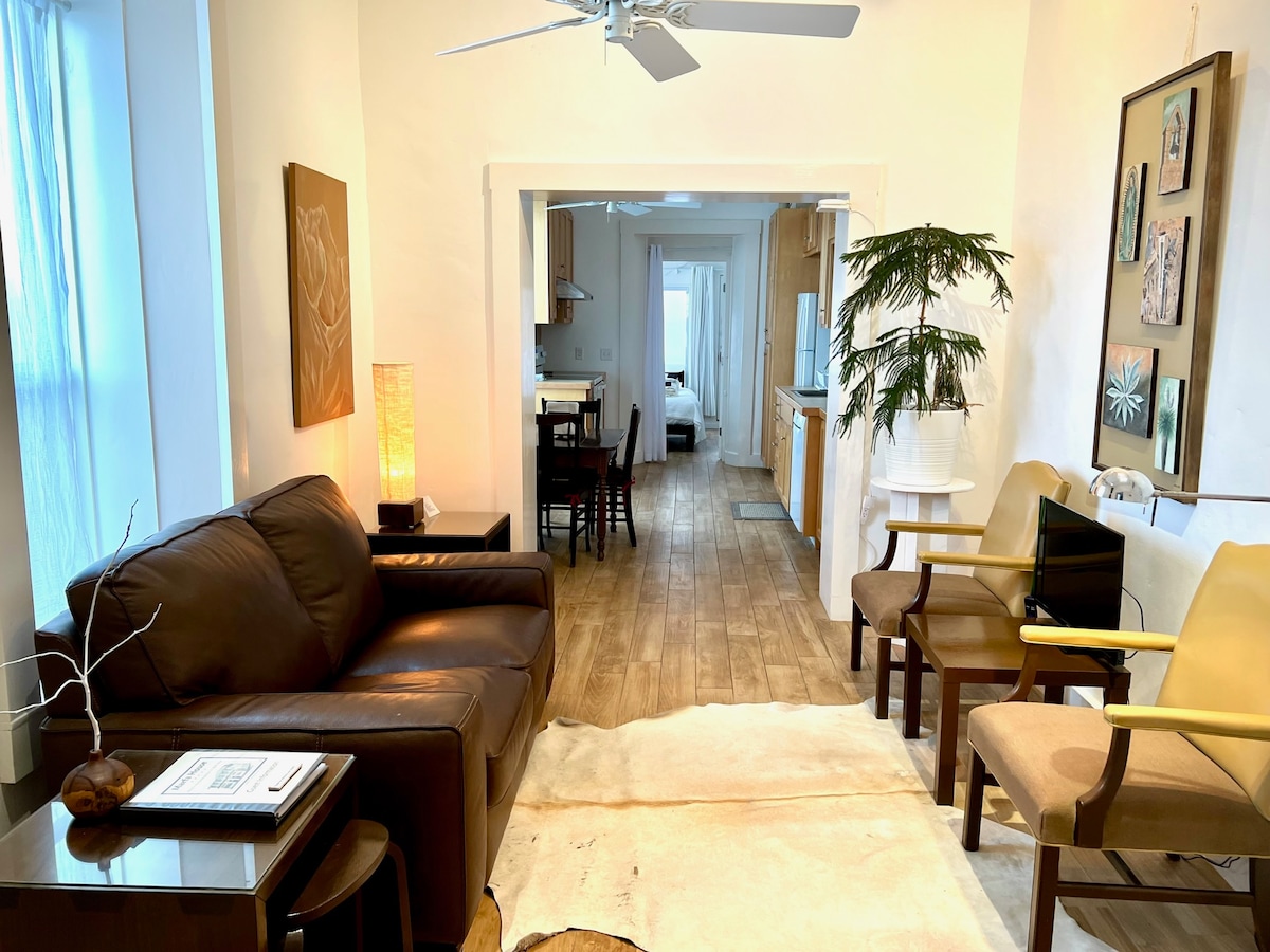The jewel of 215 Washington oozes ‘Santa Fe modern.’ The “Pippa” is a one of a kind space and guests are raving about the beds, linens, and coffee options. The penthouse comes with a full kitchen and sleeps up to four guests. Stretch out on the oversized leather couch and take in the suite’s mid-century modern furniture, hip photography, Navajo-style rugs and Oaxacan tiles. The building is just steps from the Santa Fe Plaza and all the restaurants, bars and shops Santa Fe has to offer.