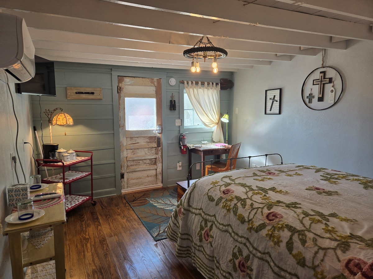 Feel refreshed when you stay in this rustic gem. SC can sleep 4 comfortably. The kitchenette is equipped with a coffee maker, toaster, electric kettle, microwave and refrigerator. The bathroom has extra amenities in case you forget something. The shower, which has exposed copper plumbing, is sure to impress. Outside there is a small patio with adirondack chairs and gas fire pit that over look the cattle pasture and the stunning Panhandle sunsets.