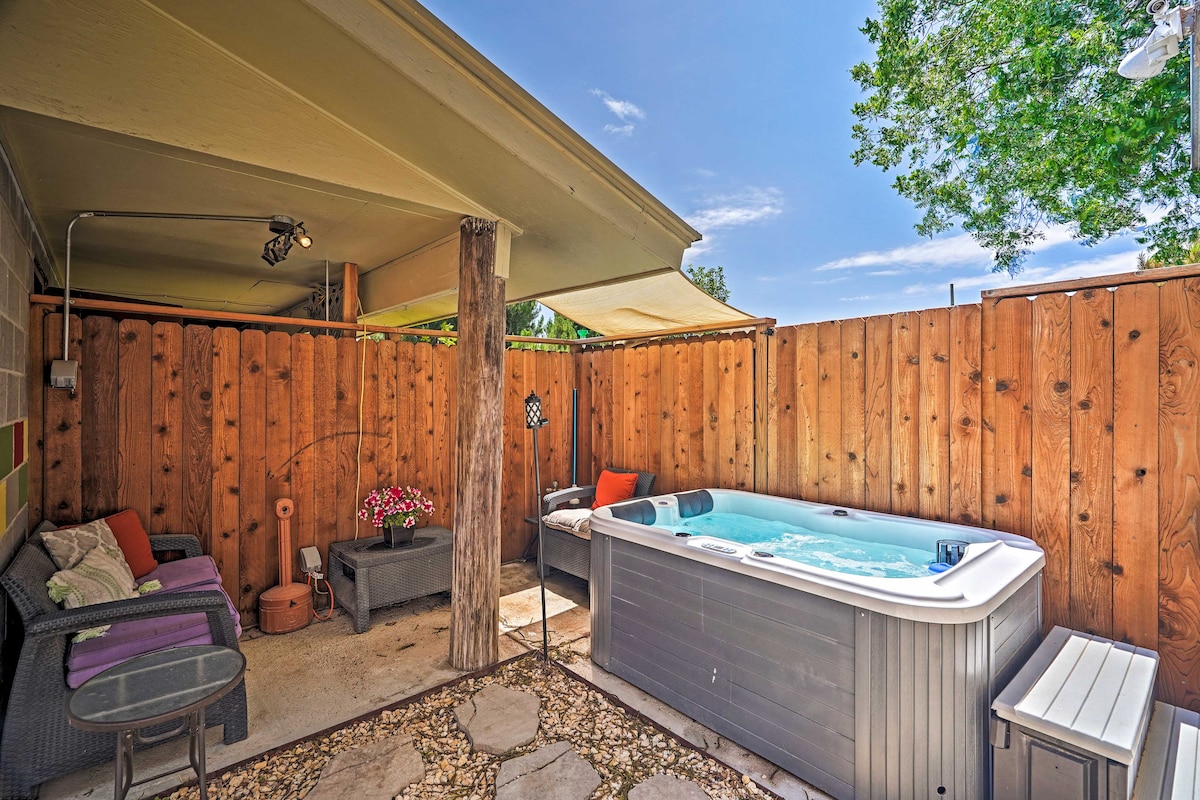 You'll love staying in one of our cities' most interesting neighborhoods, an arts district where the locals live. We're 1.8 miles (10 mins drive) from the plaza & close to Meow Wolf. Cafes a 2 min walk. We are in a local arts area. If you want to stay near the touristy plaza-- not us. Also, no TV, but 300 MPS wifi. Our artfully designed cozy 220 sq/ft flat has a queen bed, a well equipped efficiency kitchen, and your own bathroom. Plus, the exterior deck is ideal for catching sunset views.