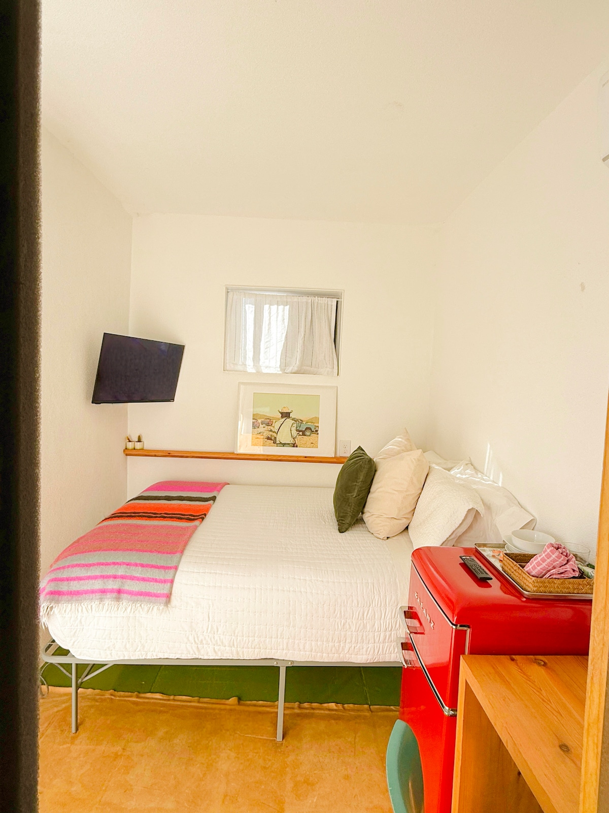 Philadelphia Street Containers is a boutique-style hotel container experience. There are five private spaces within the complex, all ranging in different sizes and designed to perfection. Rent the entire hotel or rent each space individually. “Judy” is a 200sf private space with a walk-in shower, queen-size bed, desk, and fun art throughout. Outdoor spaces, including the cowboy pool, are shared with guests renting the four other units.