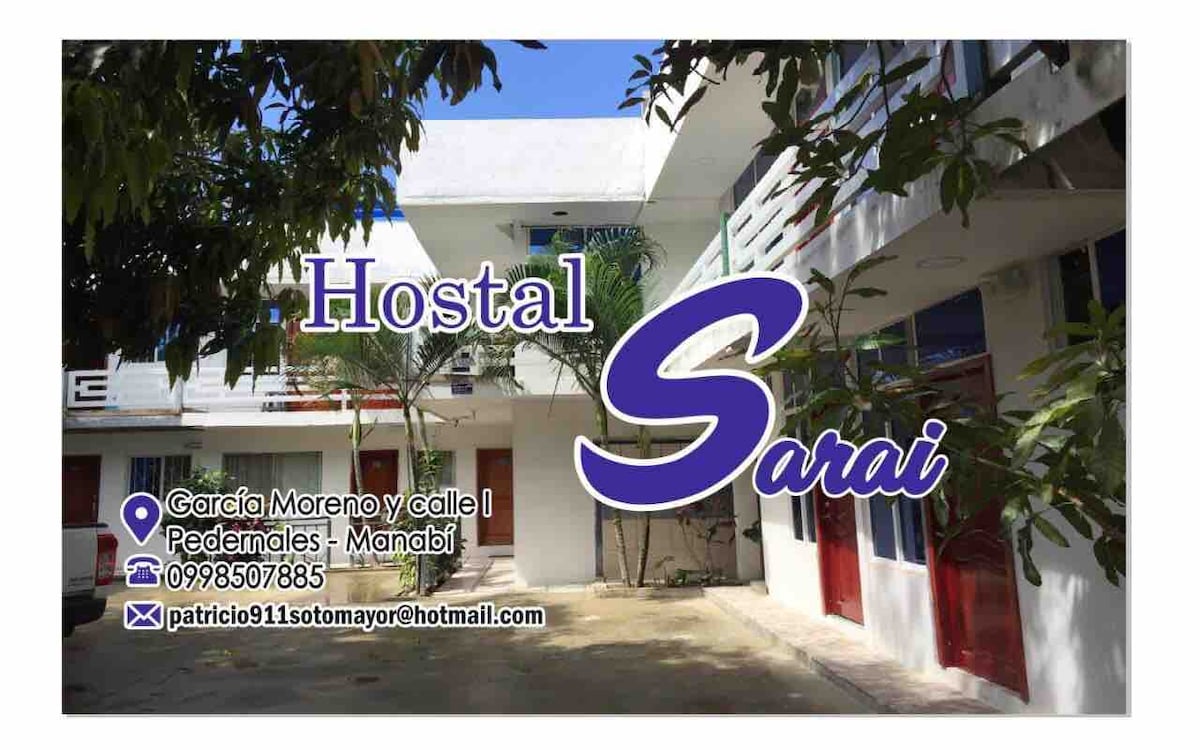 Hostal Saraí está ubicada en Pedernales a media cuadra de la playa cuenta con 16 habitaciones dotada cada una de baño privado , aire acondicionado , agua caliente , televisión por cable de pantalla plana , parqueadero , wifi gratuito ,área de relax con cuatro amacas rodeado de árboles q harán más placentera su estadía para q se sienta como en casa, cuenta con 5 duchas exteriores y tres baños sociales adicionales , balcón , una terraza y jardines al rededor