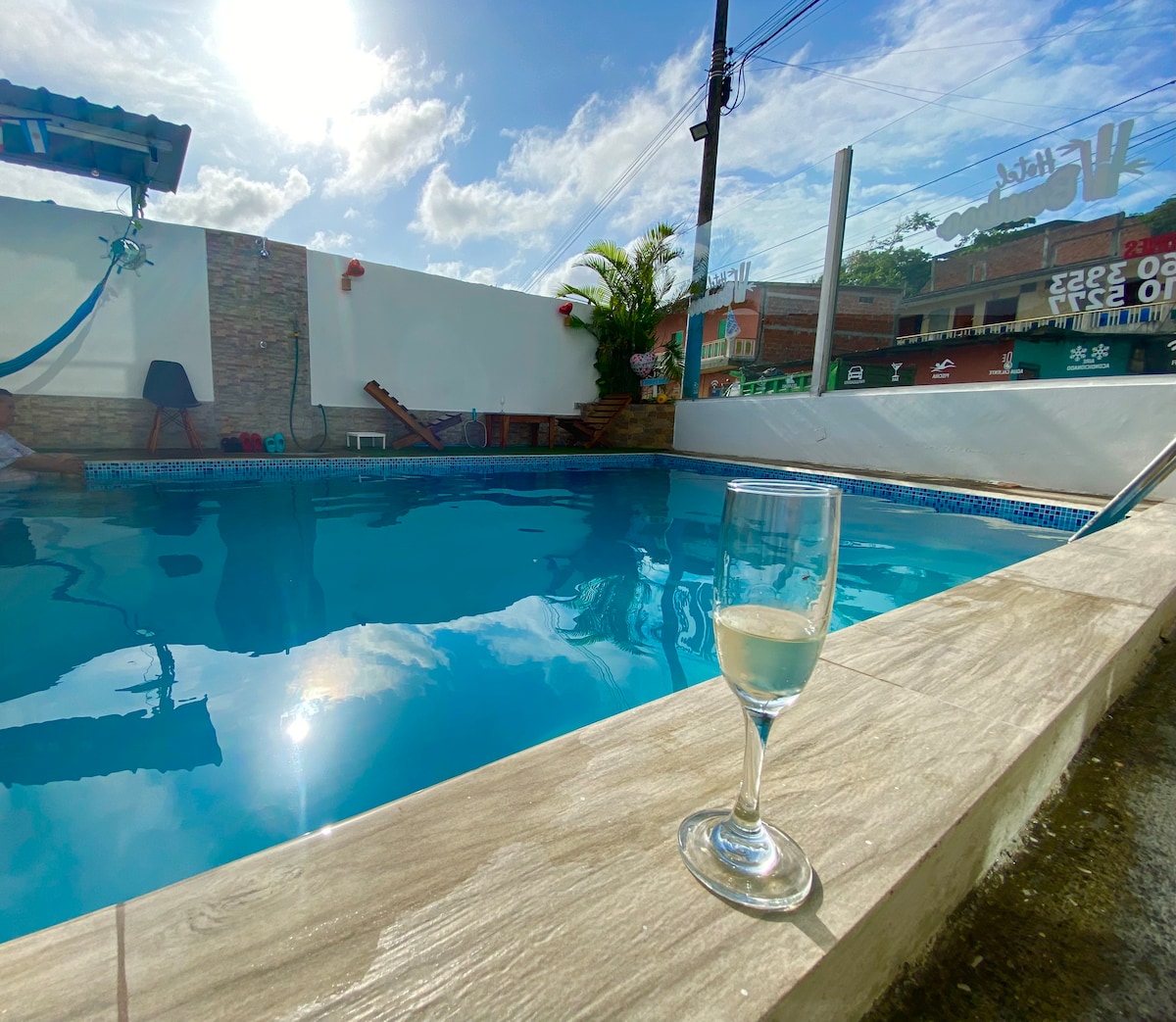 Este moderno lugar te ofrece muchos detalles encantadores.Para garantizar tu estadía gunto a tu familia, te ofrecemos un excelente descanso y contamos con piscina-hidromasaje-sauna-parqueadero-área para asados -wifi y guardiania tenemos varias habitaciones matrimoniales, dobles y triples con aire acondicionado y cn ventilador también contamos con hamacas, muebles para que te reúnas a conversar con los tuyos visitamos te esperamos ..pd aceptamos a tu mascotas
