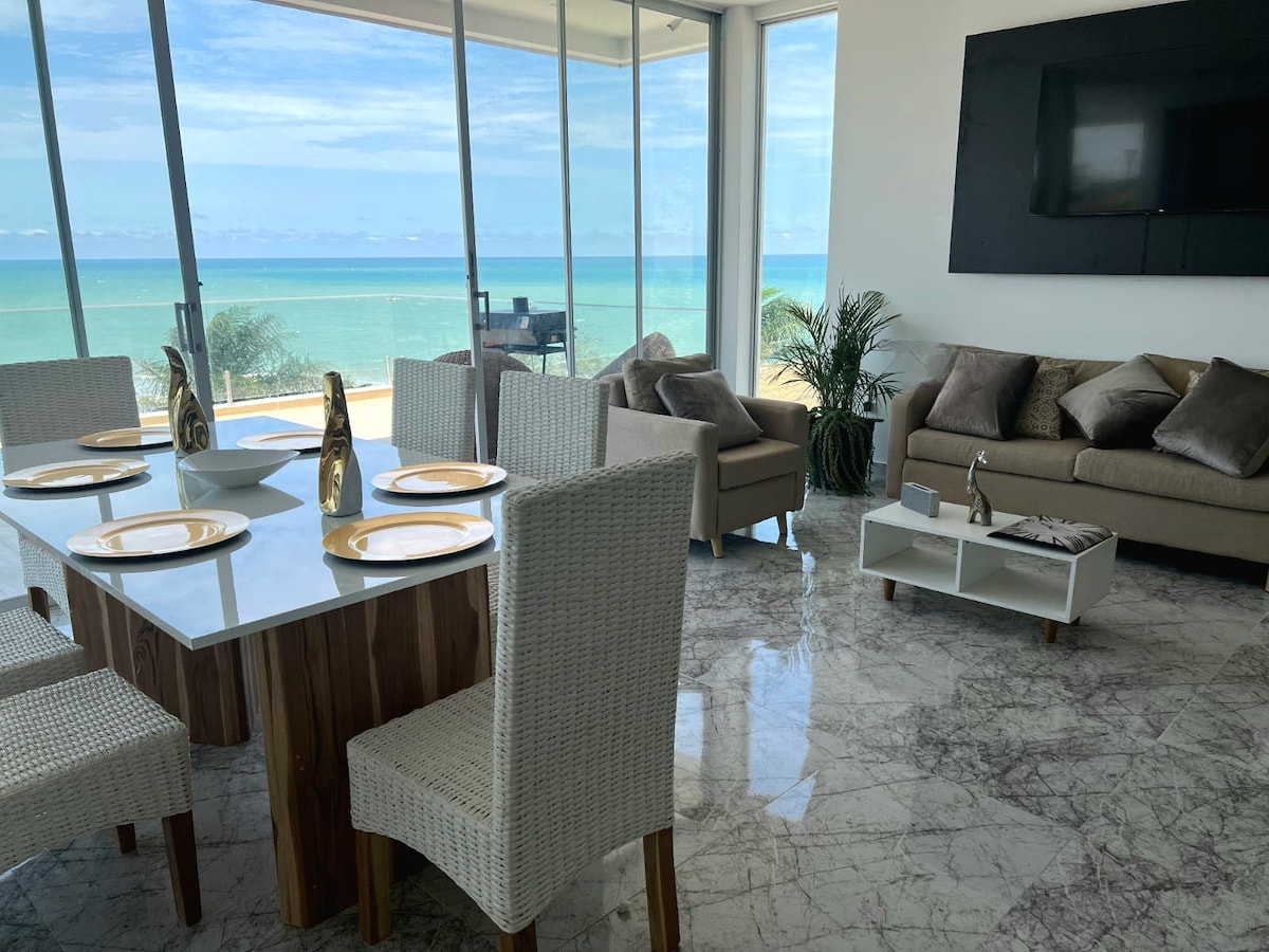 Moderno y Elejante departamento con una amplia terraza con 180 grados de espectacular vista al mar. Ubicado en Costa Sol, urbanización privada. Piscina y acceso directo a la playa. Amigable para personas discapacitadas.