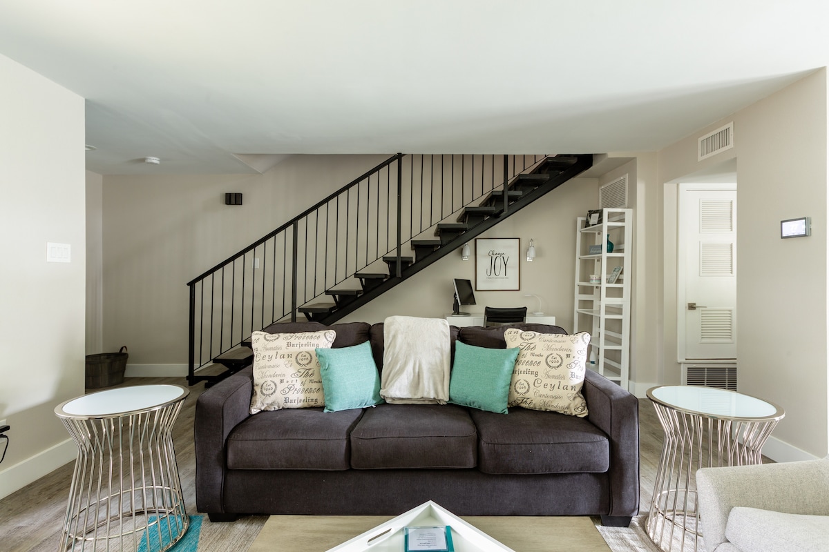 Here's the RUNDOWN: - QUICK drive to MAIN STREET - 2 parking spots RIGHT OUTSIDE + visitor parking - Sleepy-time = Chill time - Bedroom w/ KING Serta i-Series mattress & 55"TV - Spacious living w/ 4K 70"TV, ATARI Console & KING pullout - Sign in to YOUR STREAMING services! - 2 private patio spaces (yes two!) w/ gas FIRE PIT - Dartboard & games - COTTON bedding - NEW SINGLE-LEVEL condo - EQUIPPED kitchen - Dining + bistro table, dual as office & island!