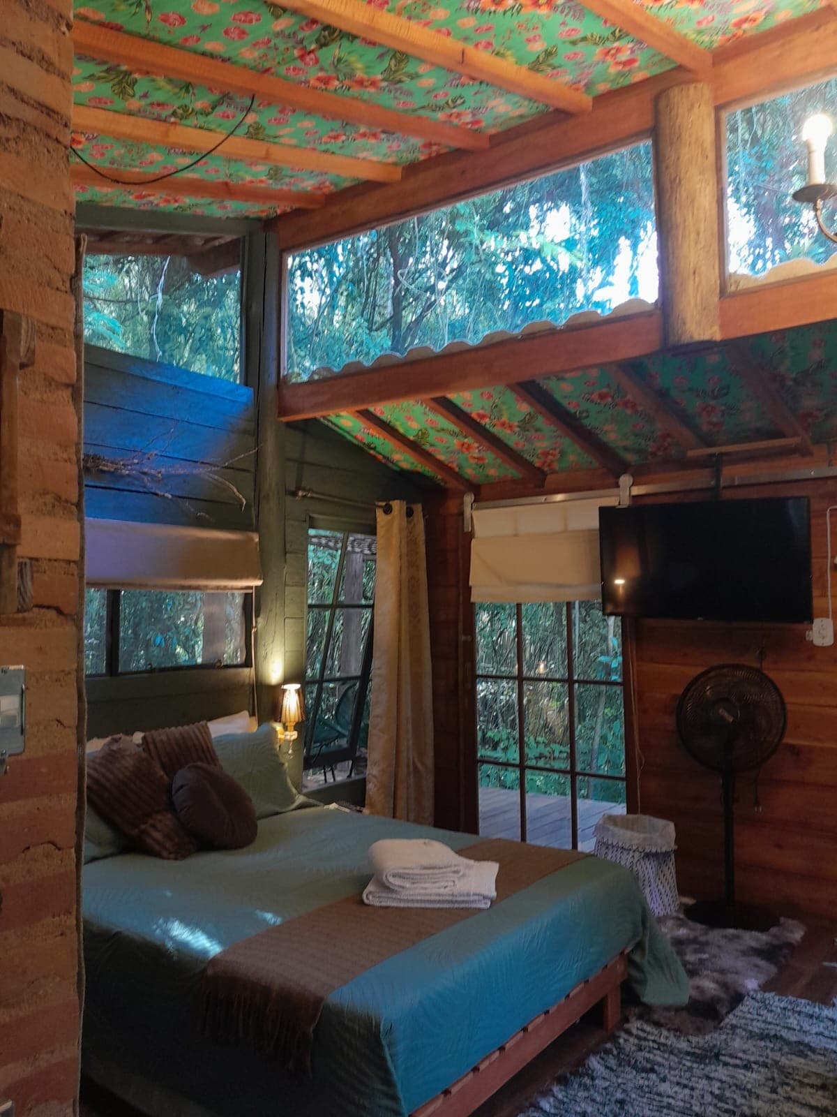 This brand new house sits high above the trees inside the Aldeia Rizoma eco village, a gated property 15 minutes away from the city historical center. The property offers a jungle gym, sauna (paid as an extra), private trails and access to 5 private waterfalls. The one bedroom studio has a king size bed built high so you can watch the forrest from it. It offers a private hot tube and a fully equipped kitchen. There is an extra bed that can be used for a third person with an extra fee per night