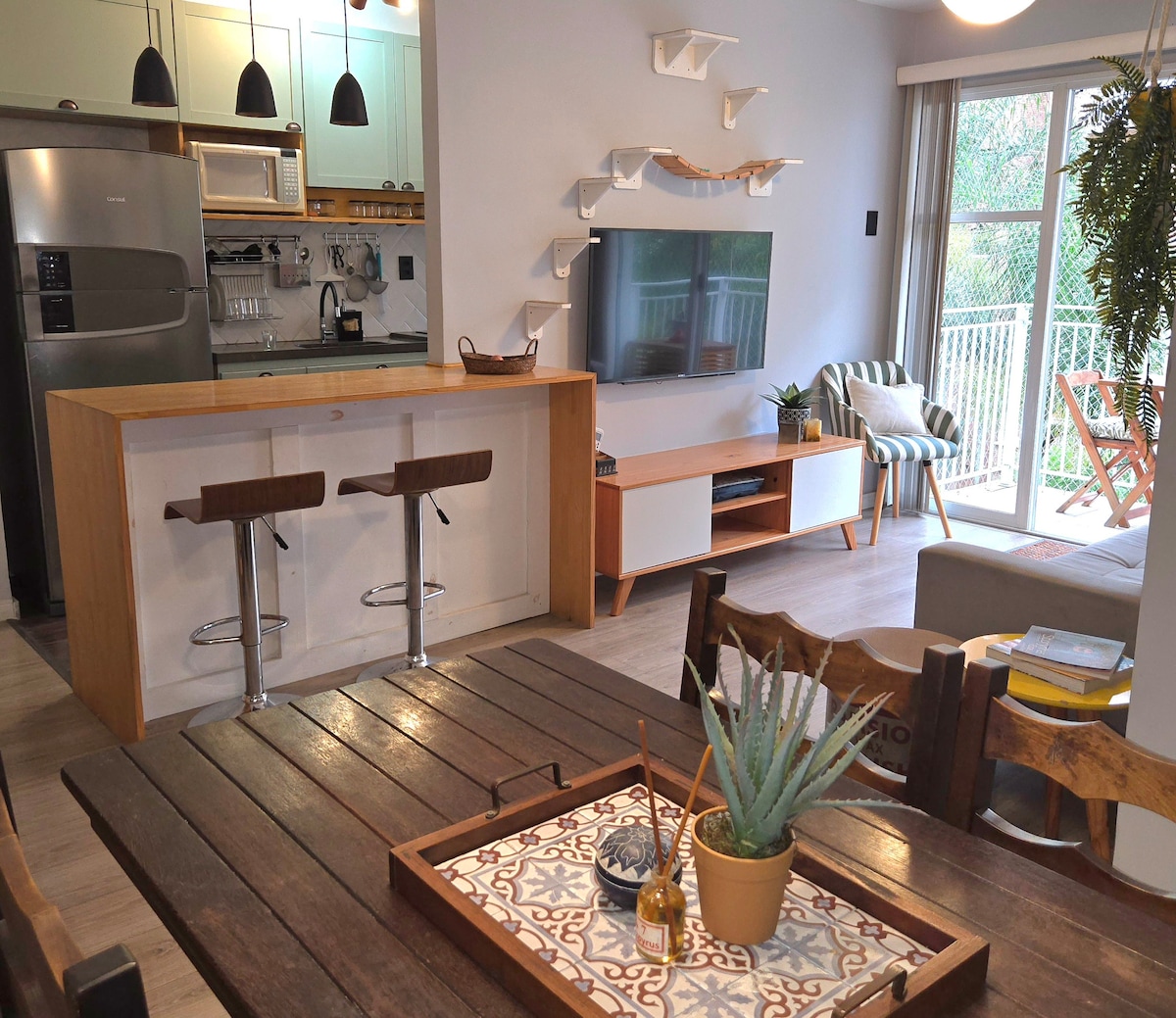 Este lugar único tem um estilo próprio, acabou de ser reformado, vista lindinha para o Cristo Redentor, rústico e simples ao mesmo tempo que confortável. Terracinho agradável com Ofuro, churrasqueira e espaço gourmet. Suíte principal ampla com banheira de hidromassagem Cozinha integrada a sala, sensação agradável de amplitude. No coração de Copacabana, perto do metrô, comércio, supermercados e a uma quadra da praia.