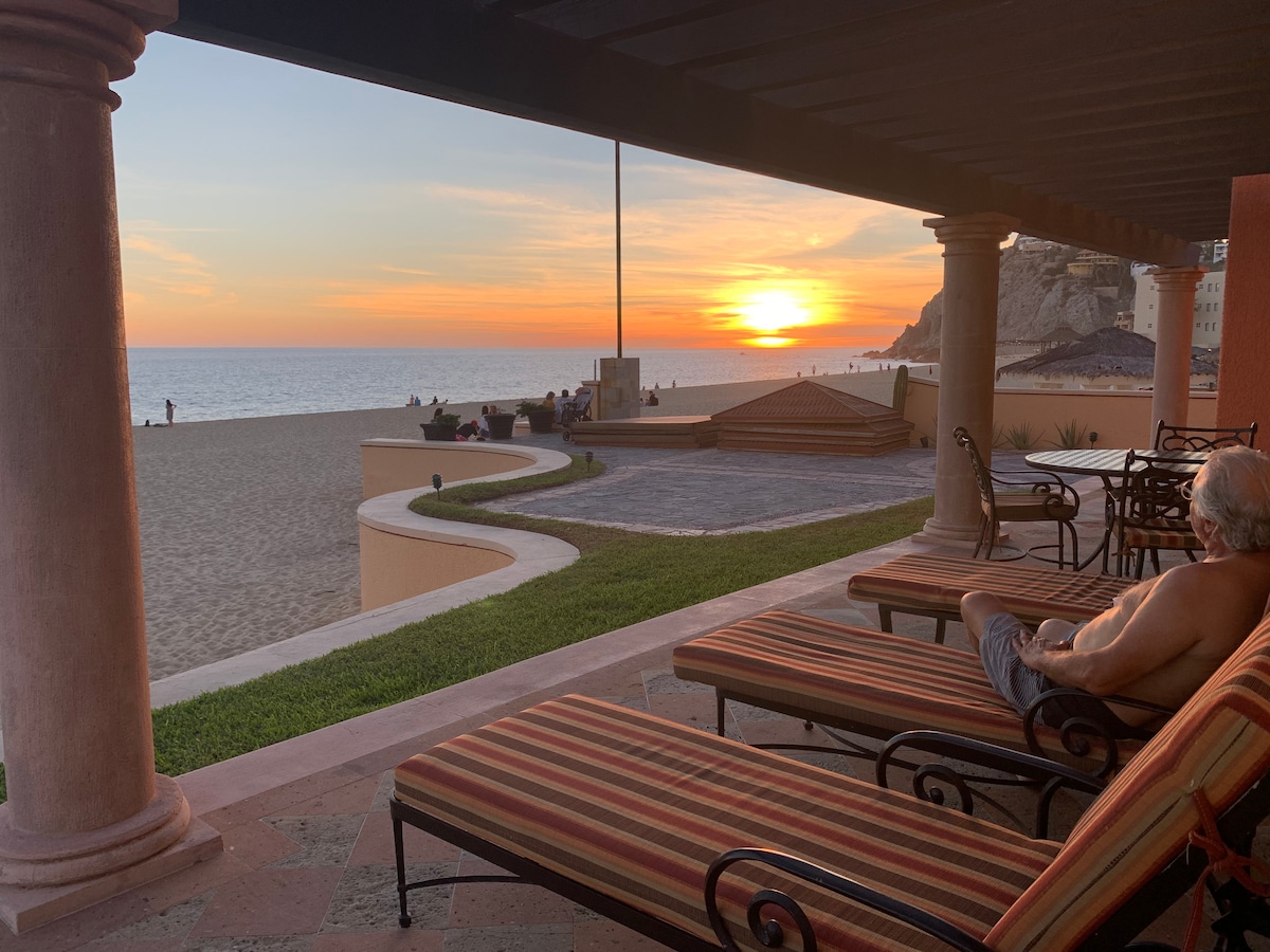 Available PRIME NEW YEAR'S WEEK SUNDAY TO SUNDAY. All bookings pay full week's fees. Two beautifully appointed en suite bedrooms with a third sleeper in living area with a full bath in prime beachfront unit. Full service resort spa, tennis court, gym and putt putt range on premise. Several pools. The resort hosts activities and themed parties daily. Walk into town to the marina to enjoy all the great restaurants, sports activities and shops that Cabo is famous for. A wonderful escape awaits!