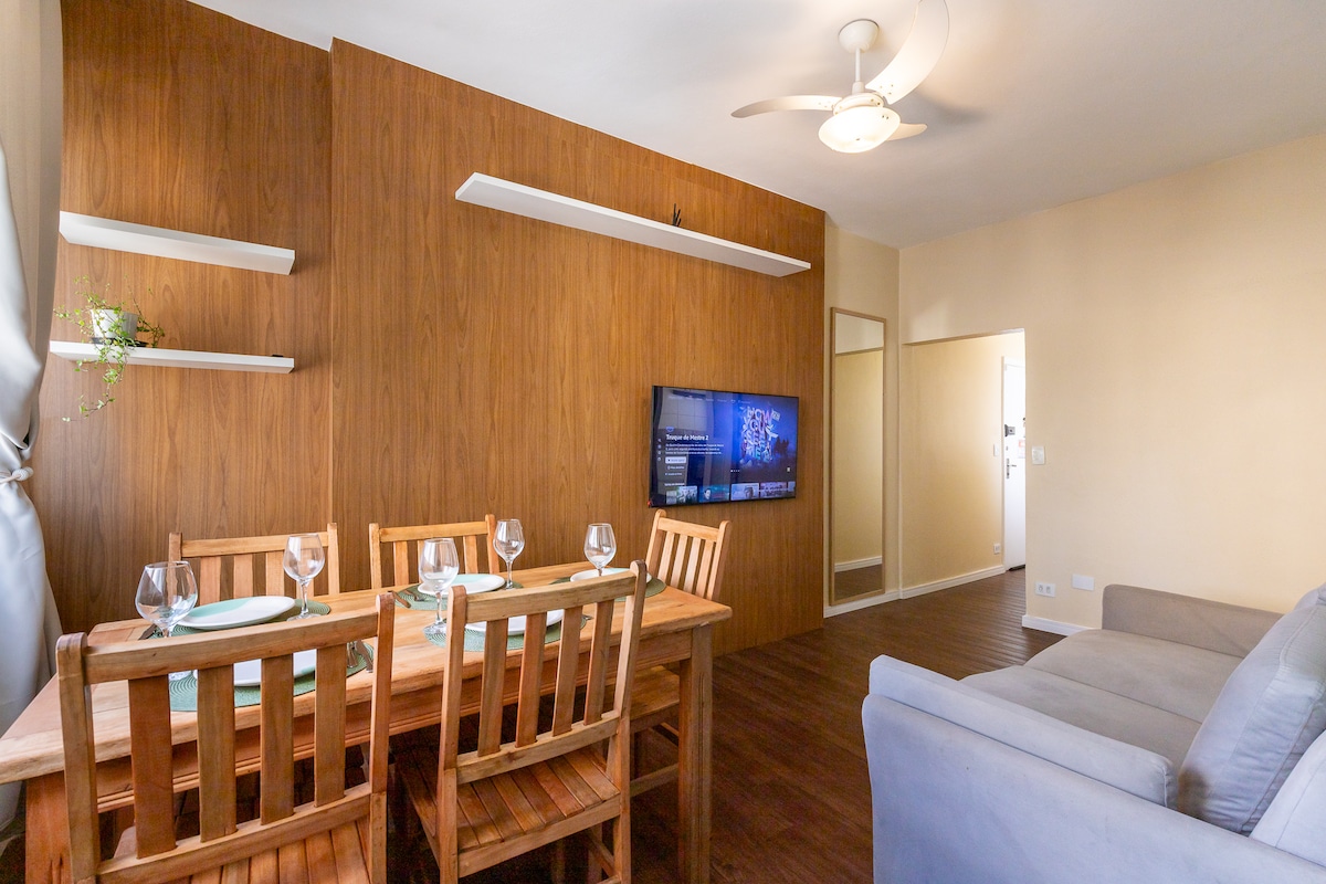 (Acabo de lançar esse ap por isso não tenho avaliações. Confira no meu perfil que tenho centenas de 5 estrelas!) Apto de 1 quarto com muitos espaço. Ambientes amplos, um lavabo + banheiro completo. 61m2 de conforto, estilo, praticidade e luxo. Tudo na melhor localização de Campinas (parte nobre do Cambuí onde tudo de bom está localizado) Prédio com academia, portaria 24h, piscina de revestimento importado, área de lazer completa. Cama de casal + cama solteiro retrátil + sofá cama na sala.