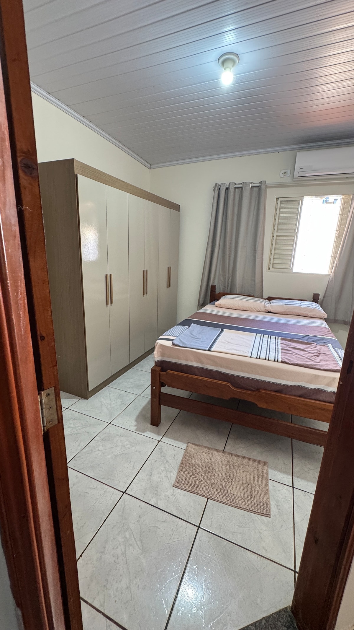 Casa aconchegante a 5 km do centro, com 2 quartos e 2 banheiros, ideal para até 5 pessoas (2 camas de casal e 1 de solteiro). Ambientes ventilados, com ar-condicionado, cozinha completa, Wi-Fi e garagem coberta. A casa é totalmente privativa. Moro em outra casa no mesmo terreno. O acesso é pela garagem, usada apenas como passagem compartilhada.