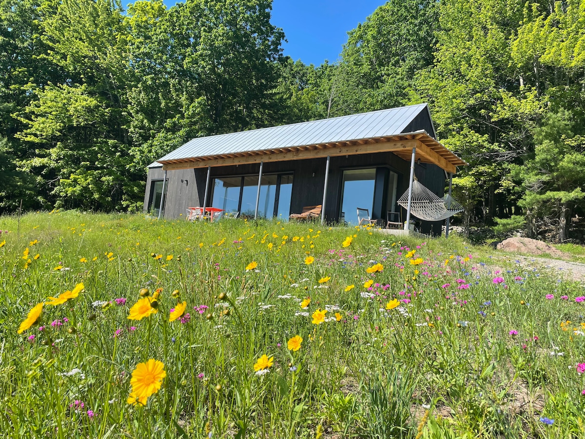Just the perfect cabin. This newly built, passive solar house has a wood-burning stove, incredible views and is drenched with light. The house is intimate yet connected to the outside, with total seclusion and every imaginable modern convenience! It’s an architect-designed marvel of concrete, glass and reclaimed wood that sits on 135 acres of field and forest with a lovely swimming pond and miles of hiking trails. The cabin sleeps up to 6 people in two bedrooms and a spacious sleeping loft.