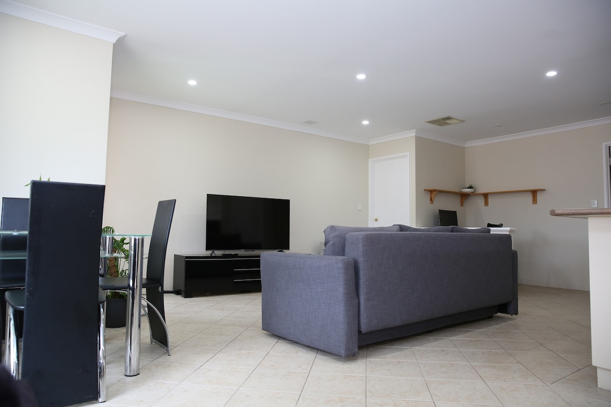 Close to South Beach & Fremantle, this spacious 3 bedroom upper floor apartment sleeps 6 in comfort. Adele the owner lives downstairs. Separate side access, King sized beds and undercover balcony. The whisper quiet location ideally suits travelling families seeking rest and relaxation. Fully equipped kitchen, inc dishwasher, oven , cooktop , fridge/freezer & washing machine in unit with drying racks. Smart TV, Netflix, high speed wifi, free street parking, 5 min drive to Fremantle & shops.