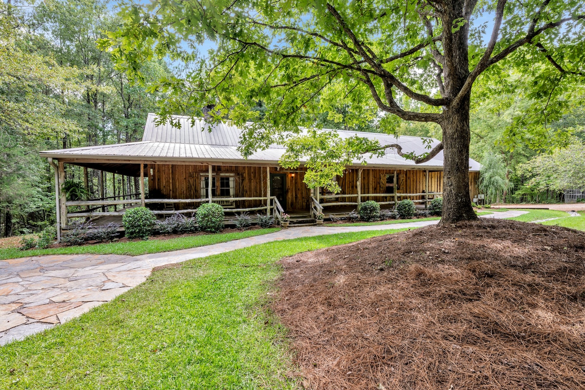 The TinyBarn at Covenant Woodlands is a lofted 350 sq ft glamping cottage in the piney woods of AL. Made with love from locally reclaimed upcycled materials. Equipped with modern appliances that fit the nostalgic cabin vibe: an electric wood burning stove and red retro kitchen appliances complimented by bear & moose accent decor. It’s cozy, but with everything you need for a getaway. Outside you’ll find rockers, a fire pit/outdoor dining area plus a hammock and bench. Insta: @CWglampingInAL
