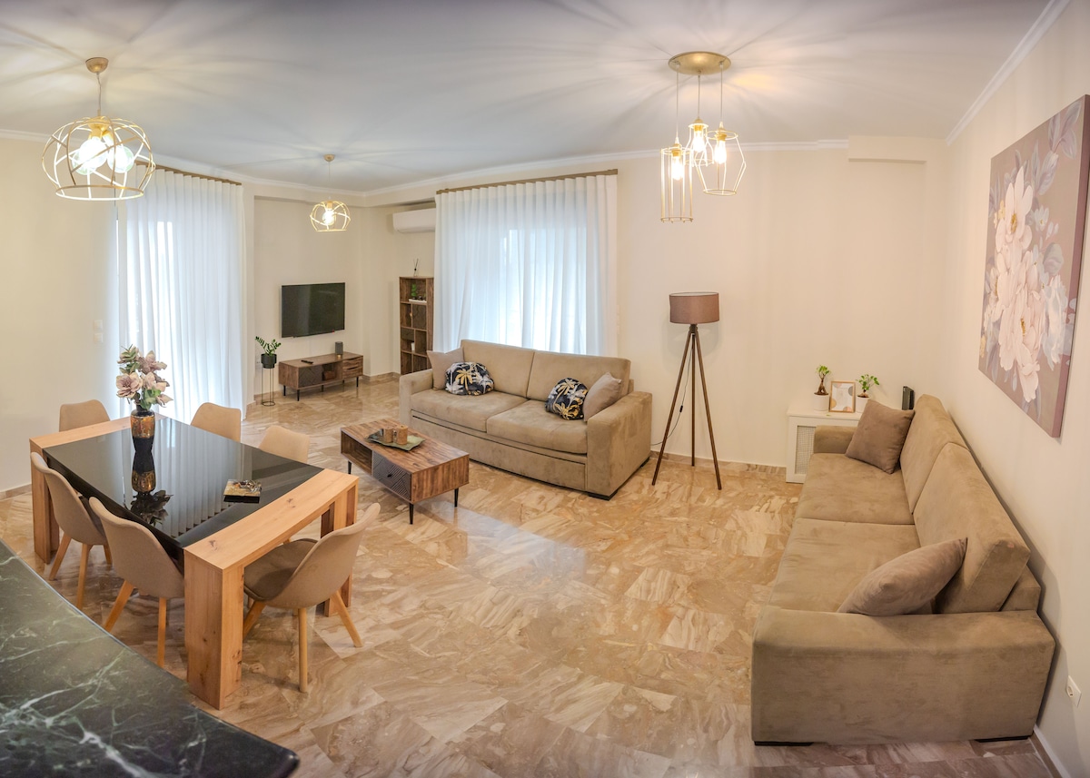 The apartment (76m) is quiet, fashionably furnished and fully equipped with balconies facing a garden. Always clean and filled with all the necessities. It is 10 minutes walk to the old town and 100 metres far from bus stop to Athens. Free parking space is available. Accommodation can be provided to couples, families, friends and business travellers. Our main goal is to help you feel at home, relax and enjoy our beautifull city...