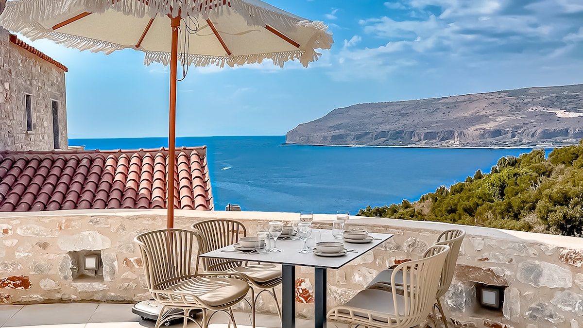 The house is located on top of the sea, with a unique view of the Messinian bay and unforgettable sunsets. It gives you the feeling that you are on board of a ship. You can enjoy the big garden as well as the rest of the space, which is designed to provide comfort and relaxation in your vacation. The sea is a walking distance from the house (5min)