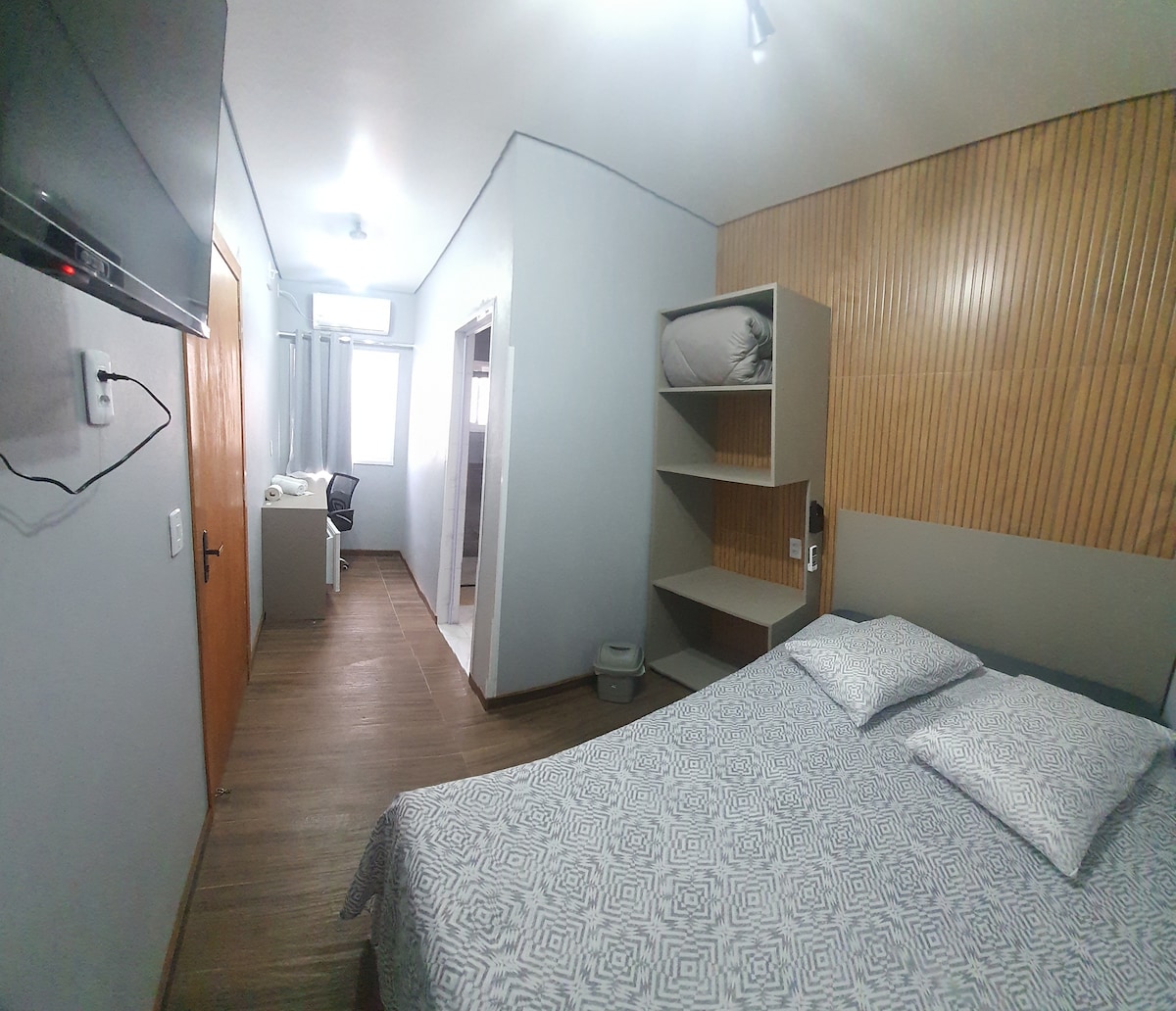Suíte com cama de casal * Banheiro privativo * Ar condicionado * Frigobar * Mesa de trabalho * TV Smart * Wi-Fi rápido * Roupeiro ♡ No térreo dispomos de um espaço de convivência para o preparo de pequenas refeições (sem fogão) ♡ Na Recepção temos uma cafezinho passado cortesia É proibido fumar em nossas acomodações. Hotel central, mercados e lojas ao redor. Estacionamento próximo por R$20,00 a pernoite ( Garagem Kely) Lugar simples, ambiente familiar, será um prazer recebê-lo!!