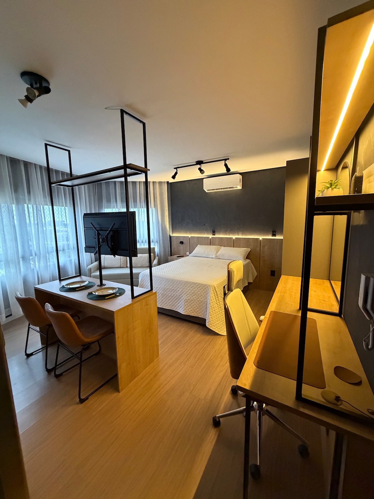 ✨️ Loft InCanto | Design e Conforto no Parque Una Refúgio sofisticado no bairro mais seguro de Pelotas. • Destaque: TV 42" 180°, IPTV e Streaming. • Conforto: Ar quente/frio, torneiras aquecidas, cama premium com Pillow e enxoval completo. • Cozinha: Indução, forno, Airfryer, micro-ondas e utensílios gourmet. • Facilidades: Secador, ferro, amenities e kit emergência. • Segurança: Portaria 24h e vaga coberta. O equilíbrio perfeito entre praticidade e bem-estar. Reserve sua experiência!