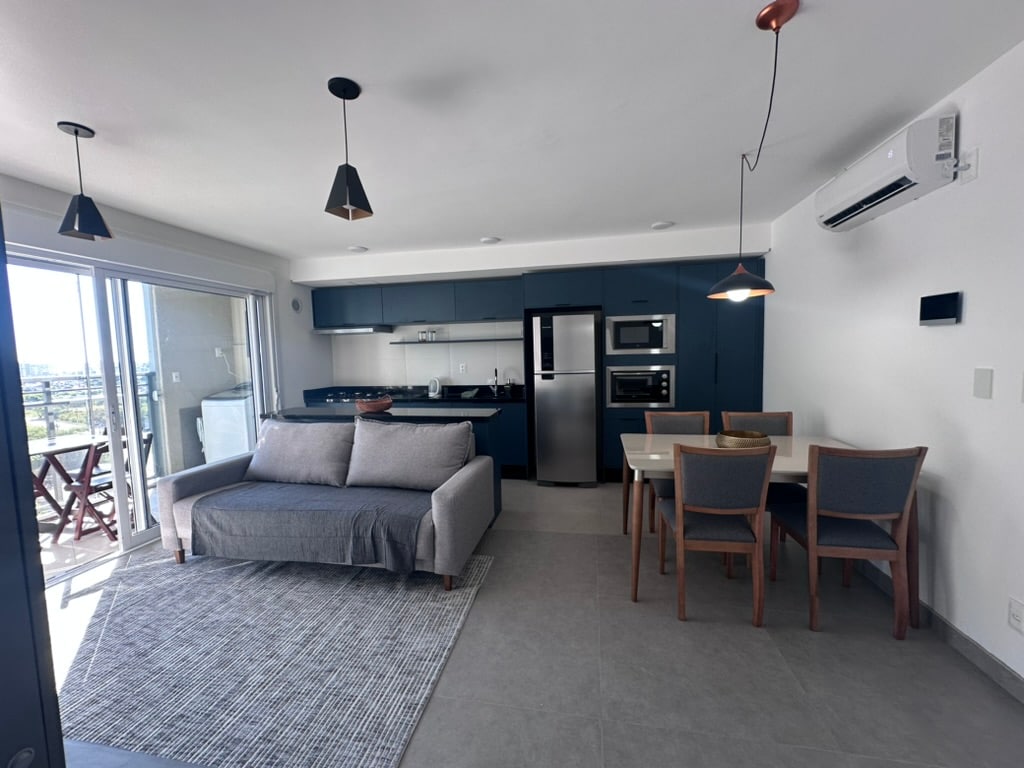 Apartamento novíssimo com 2 quartos e sacada com churrasqueira, em excelente localização. Acomoda até 4 hóspedes. Quarto principal com cama box de casal e ar condicionado, bicama de solteiro no segundo quarto e sofá-cama na sala. Em condomínio fechado com portaria 24 horas, câmeras de segurança, acesso à piscina e vaga de estacionamento. Localizado a poucos passos do Carrefour, com fácil acesso a restaurantes, lojas e farmácias. Ambiente impecável, com tudo o que você precisa.