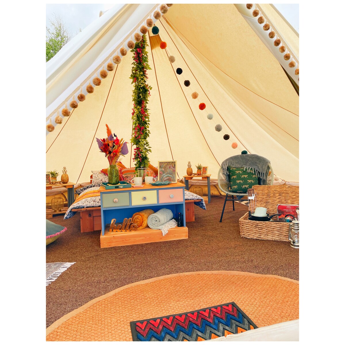 Thornbush Glamping is located in the heart of the Pembrokeshire countyside, a stones throw away from it's beautiful coastline. Just outside the village of Camrose, we are in the ideal spot to go off and explore stunning beaches and local attractions. Our bright, quirkily designed bell tent is the perfect space to relax, unwind and enjoy a glam camping experience. Equipped with a rustic kitchen, eco-friendly compost toilet and wooden shower shared with one other tent, our campsite has everything!