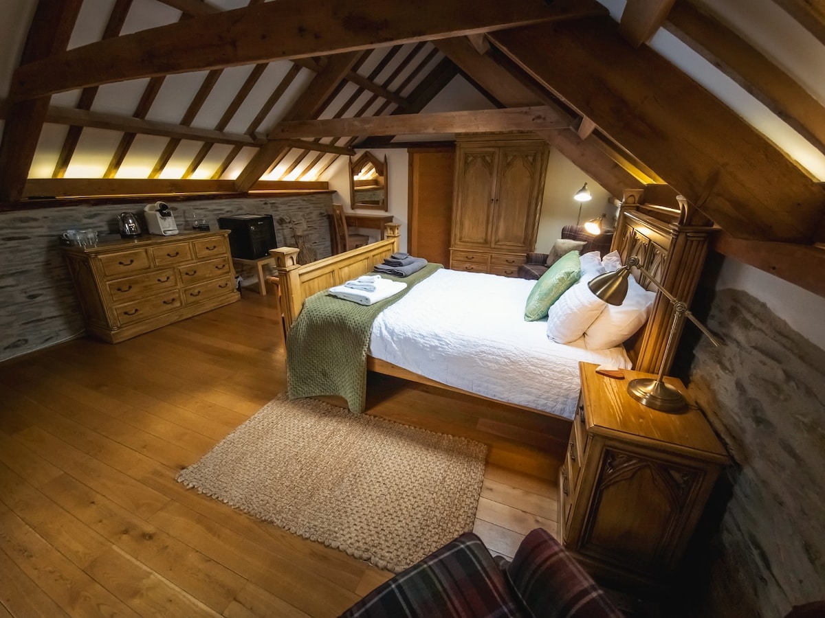 Our little farm is situated in the very heart of Pembrokeshire at the foot of the Preseli Hills. From here you can explore the Coast Path, innumerable castles, sandy beaches or historic towns. You’ll love our kingsize bed and ensuite in the converted C18th hayloft and where you can relax in your own private lounge with logburner in the old buttery. You have your own private front door to come and go as you please. Breakfast is served in our large conservatory with views over the local farmland.