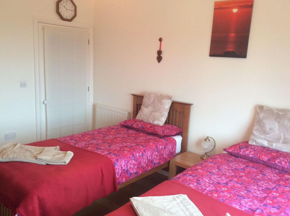 Mariners is our beautiful family home. The lockable ground floor guest room with doors opening to a patio, garden and stunning sea views/sunsets over St Brides Bay. Large twin beds can be put together if required. WiFi, tv, table,chairs, drawer unit, hanging space with toilet/shower across the hall. Tea/coffee facilities are available. Light breakfast can be provided. My husband I and our friendly Cocker Spaniel Max welcome you.