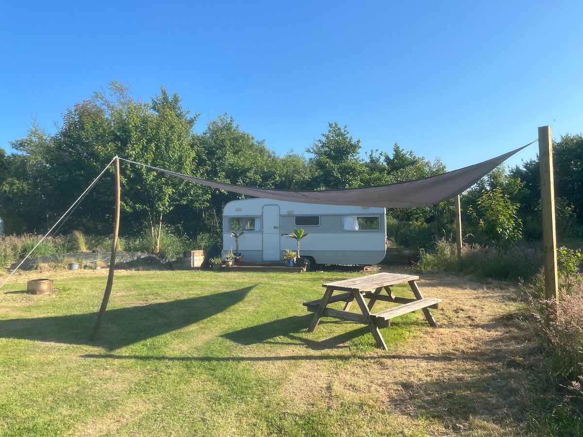 The Cwtch is a unique camping experience. Surrounded by nature, in a quirky recently converted retro caravan, proving a super comfy bed (No bedding is supplied). A log burner, sofa/chairs, dining table and camping electric are all included. You'll have your own camper’s kitchen with gas hob utensils etc. An eco/dry composting toilet (there are flushing loo's and showers in the campsite if you prefer). A fire pit is included with cooking tripod and comfy seating on a raised deck.