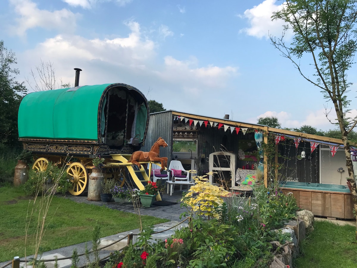Mabel bow top wagon & hot tub At Melin Mabes