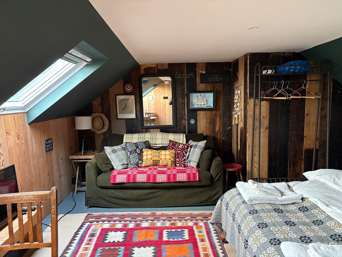 A cosy loft style room part of a traditional Welsh farmhouse on the mountain above the village of Newport Pembrokeshire . The loft has a small kitchenette under the stairs and a living bedroom in a loft, 1 king size bed and an en-suite bathroom. There is space to eat outdoors and an orchard for your private use including a hammock in the summer. In the heart of the Pembrokeshire National park with walks on the doorstep, 5 minutes walk from the village.