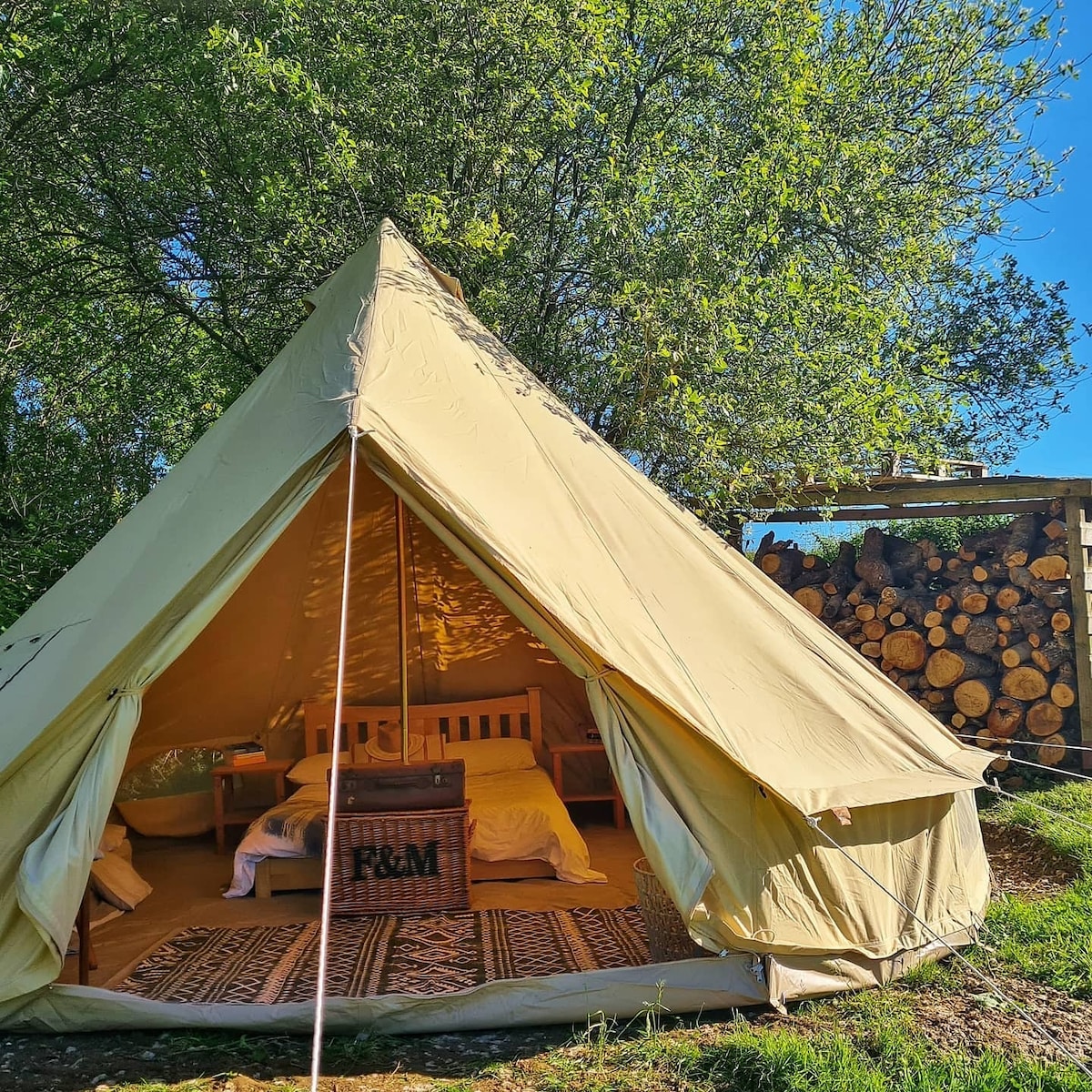 Woodland bell tent 4 minutes from Newgale beach in the heart of the Pembrokeshire National parks. The 6m tent has all you need. A double bed, two single beds, bedside table and carpet. LED lights help brighten the space at night. Because of its size there is enough space for you all. The under cover en-suite facilities and kitchen are close by, with picnic bench and outdoor fire pit for warmth under the stars. Situated in a small holding, family run eco campsite.