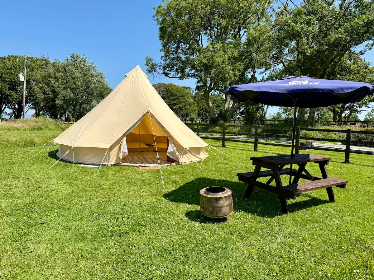 Come and relax in our campsite consisting of three 6m bell tents set in a 2 acre field. Each tent is furnished to a high standard with its own private facilities - equipped covered kitchen area, hot shower, washing up area, compost toilet and firepit. Perfect for couples or families. A play area that can be seen from each tent, is a guest favourite. Enjoy Pembrokeshire in the day and sit round a fire at night! Parking on site then a steep uphill walk to the field.