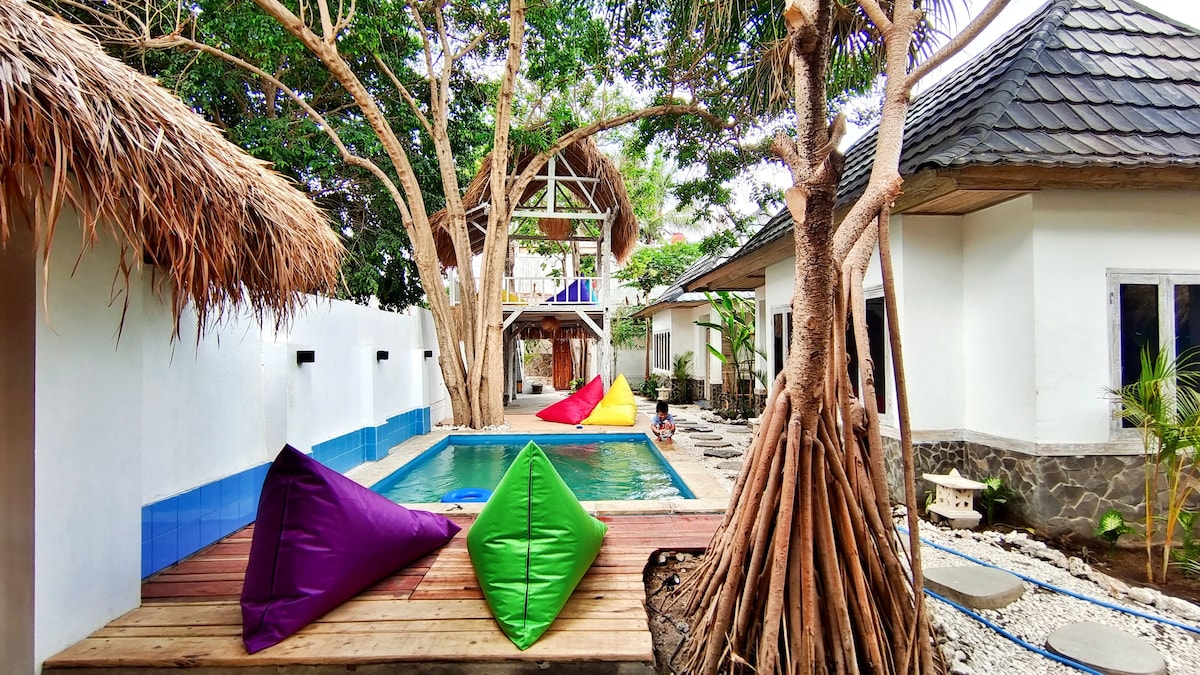 Shipwrecked paradise for bohemian wanderers and their little ones. Located on the north side of sunset boulevard you will find our hidden sanctuary. Breakfast, tea and coffee included daily. Our swimming pool is one of the largest pools in the Gilis and the bamboo movie/game room is perfect for the kids. The Deluxe room is perfect for travelers that want and need pure luxury King bed included with the option.