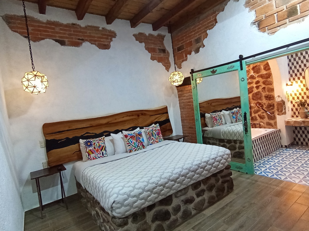 Es una cabaña de construcción ecológica ideal para parejas, o una familia, tiene jardín, en su interior encuentras la acogedora arquitectura de madera y adobe, descubrirás cómo todos los espacios fueron diseñados para descansar y disfrutar la convivencia, está ubicada en un típico barrio mexicano a 20min caminando de la plaza principal. A beautiful cabin made from ecological materials, it has a Garden, In the interior you will find how every space was design for resting