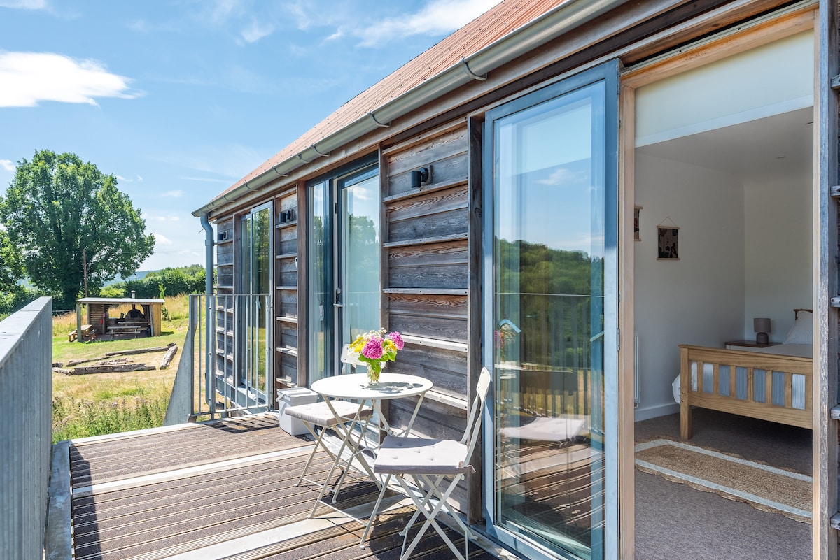 Romantic luxury loft for two on a 40-acre private estate in the Wye Valley National Landscape. Perfect for honeymooners, stargazers, proposals, anniversaries, or milestone moments. Enjoy panoramic Mork Valley views through the feature arched window, vaulted oak beams, and a cozy fire pit (logs & marshmallows incl.). Includes a generous welcome hamper and exclusive access to our dark skies, meadows, stream, and woodland. A peaceful, magical retreat with high-end, curated experiences available.