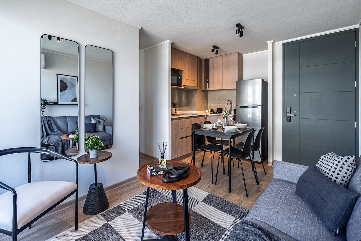 Spacious and cozy Nordic-style apartment in a quiet and central neighborhood of Ñuñoa. Just 7 minutes from the metro and steps from Plaza Ñuñoa, close to the mall, Estadio Nacional, restaurants, and essential services. It features a smart lock for self check-in, 24/7 security, and private parking in the building. The building also offers a gym, pool, and laundry facilities. Includes air conditioning, a fully equipped kitchen, Wi-Fi, and workspace. Ideal well-connected stay in Santiago.