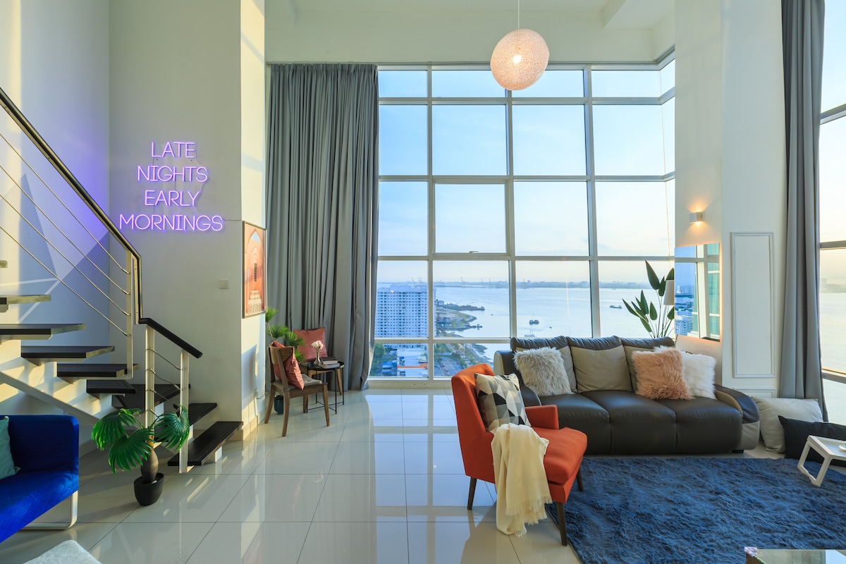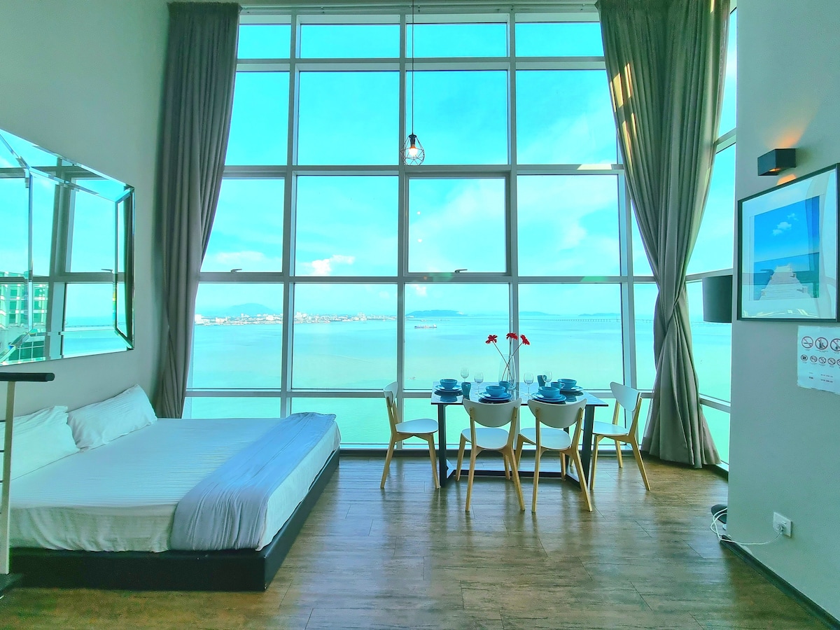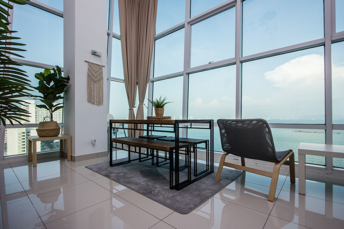 Hosting is our passion! Why our guest love us? •We are 5 stars SUPERHOST •180° PANORAMIC SEAVIEW •Slumberland branded mattress (hotel standard) •At waterfront •1000 square feet (whole duplex unit) •1 private car park •TIMES WiFi •Netflix TV •30 restaurants, cafes, pubs, Starbucks, Coffee Bean, Subway, 7-Eleven •Fully air-conditioned •5 to 10 minutes drive to Chew Jetty and UNESCO Heritage old town •15 - 20 minutes to airport