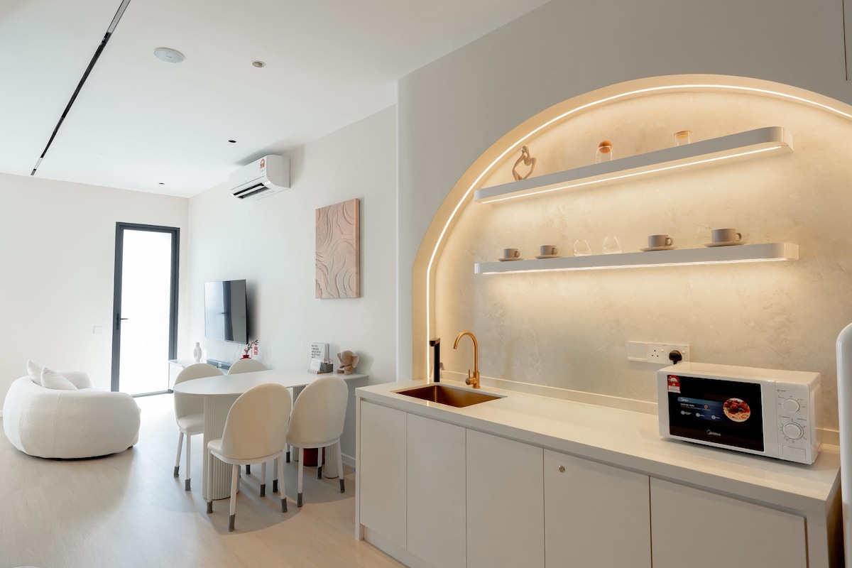 Welcome to Arc & Glow, a brand-new designer homestay at Macalisterz 22, located in the heart of George Town, Penang. Thoughtfully designed with modern elegance and calm tones, this home is perfect for guests who value comfort and cleanliness. We prioritise sleep quality, featuring a hotel-grade mattress that is supportive and comfortable — not overly soft. We look forward to welcoming you and providing a stay that is simple, elegant and truly comfortable.