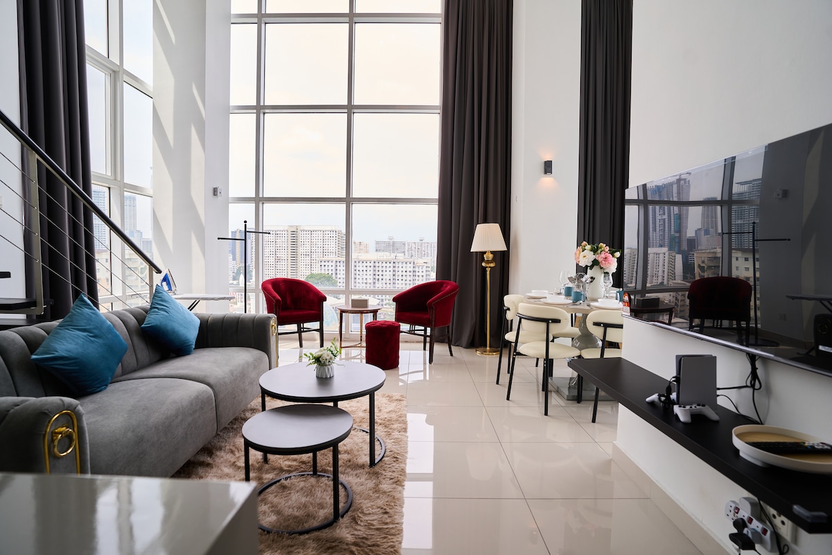Maritime Suite is located along Karpal Singh Drive, the heart of Georgetown, Penang. It is a duplex apartment which comes with high ceiling and tall windows that offer a breathtaking panoramic sea view in the daytime and stunning city view at night. Our duplex suite is located at the highest floor of Maritime Suite, it comes with: 2 bedrooms 1 living room 2 bathrooms Opened kitchen with dining area.