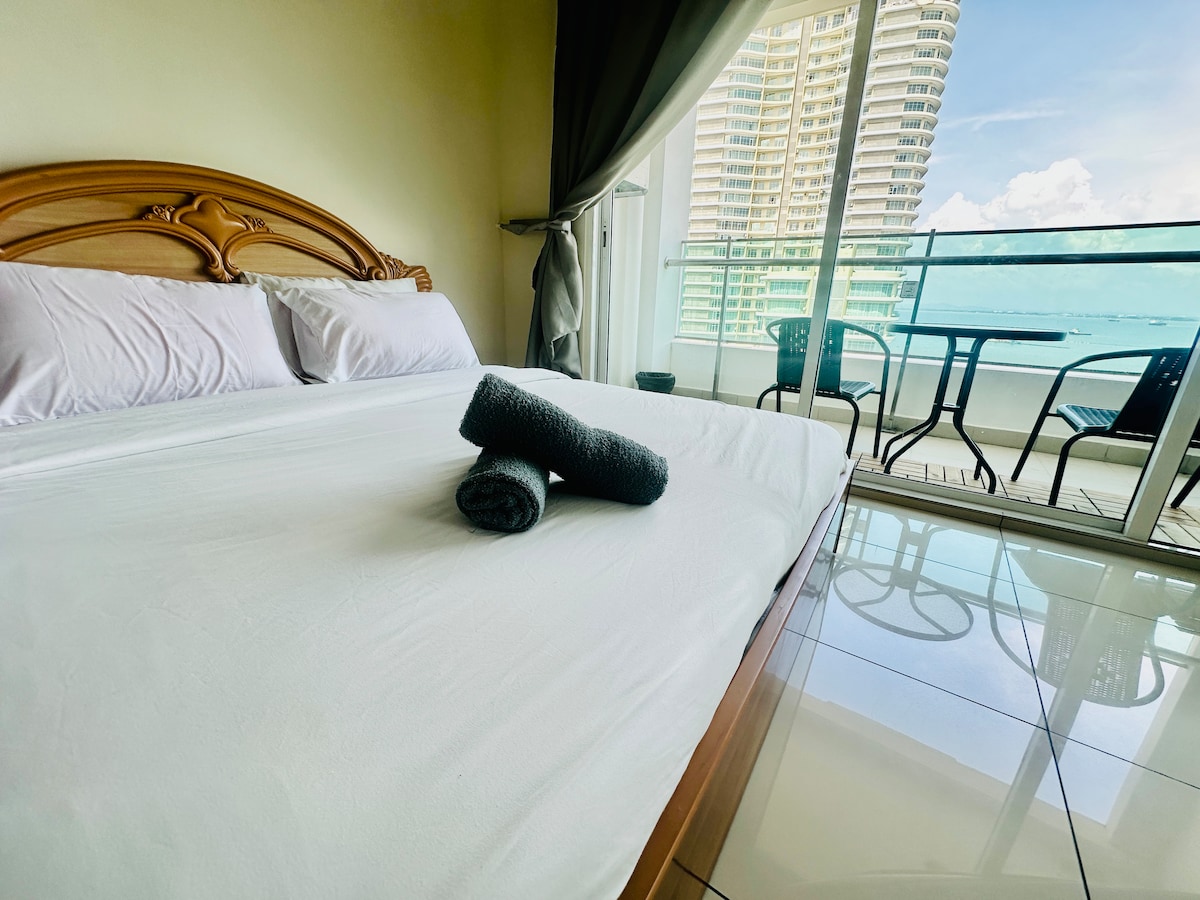 Enjoy a stunning sea view from the huge balcony, relax with Netflix. Located near to Gurney Plaza and surrounding with lots of restaurants, groceries and convenience stores. • 8 mins to Gurney Plaza • 27 mins to Escape Park • 12 mins to Botanical Garden - 2 queen size bed ( master bedroom) - 1 single bed from ikea with 2 single mattress. 1 free parking. If you have extra cars, the paid parking is very safe and reasonable price. The house is located above the ‘Straits Quay Retail Marina’ mall.