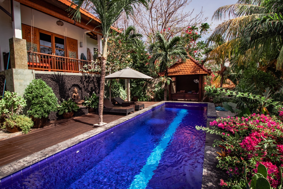 Your very own Beach House with a pool . Perfect for a family vacation, quality time with a group, or a romantic getaway. 3 bedrooms with AirCon, 3 baths. Swim in a 10-meter long pool, jump in the ocean. Some of the best diving & snorkeling on the coast just out the gate. Recline & rejuvenate in a variety of delightful private spaces, the bale with cushions & pergola and pool with sunbeds&hammocks. The owner/chef is renowned for having the Best Balinese food in Bali, served to you by the ocean.