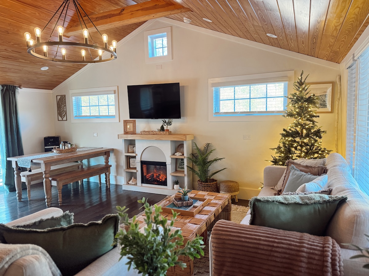 Tucked away on a serene 10-acre farm, this guest space blends rustic charm with subtle sophistication. Enjoy the sounds of clucking chickens, a mini donkey grazing nearby, and a rescue pup. The farm is also home to deer, wild turkeys, barn swallows, hawks, and bunnies. With no major roads nearby and tall pines all around, you'll experience true peace and quiet — your own private haven to relax, reflect, and create.