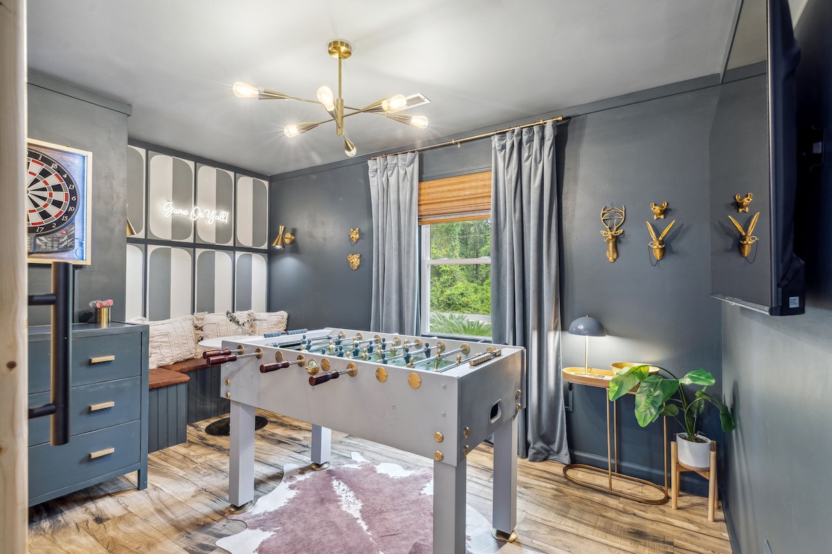 Coastal Retreat w/ Backyard Oasis & Game Room with all the amenities for a fun and relaxing stay all tucked away in a peaceful, natural setting. Conveniently located near beaches and Historic Downtown Wilmington. This beautifully updated home sleeps 6-8 guests and features comfortable living spaces throughout. Relax in the tranquil backyard, lounge around the cowboy pool, entertain in the outdoor kitchen and dining areas or cozy up by the fire pit. An ideal stay for an unforgettable vacation.