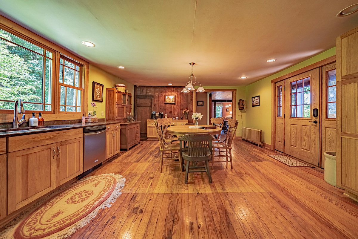 Featured in Buffalo Spree and Artvoice, this timber-frame home features stunning hickory and black walnut interiors illuminated by two-story windows that face the morning sun. Radiant floor heating and earthen-plaster climate design. Wake up in queen and king beds, lounge under covered verandas, and shop right next door at Thorpe’s organic farm store. • 7 minutes from the Village of East Aurora • 24 minutes from Bills stadium • 1 hour from Niagara Falls