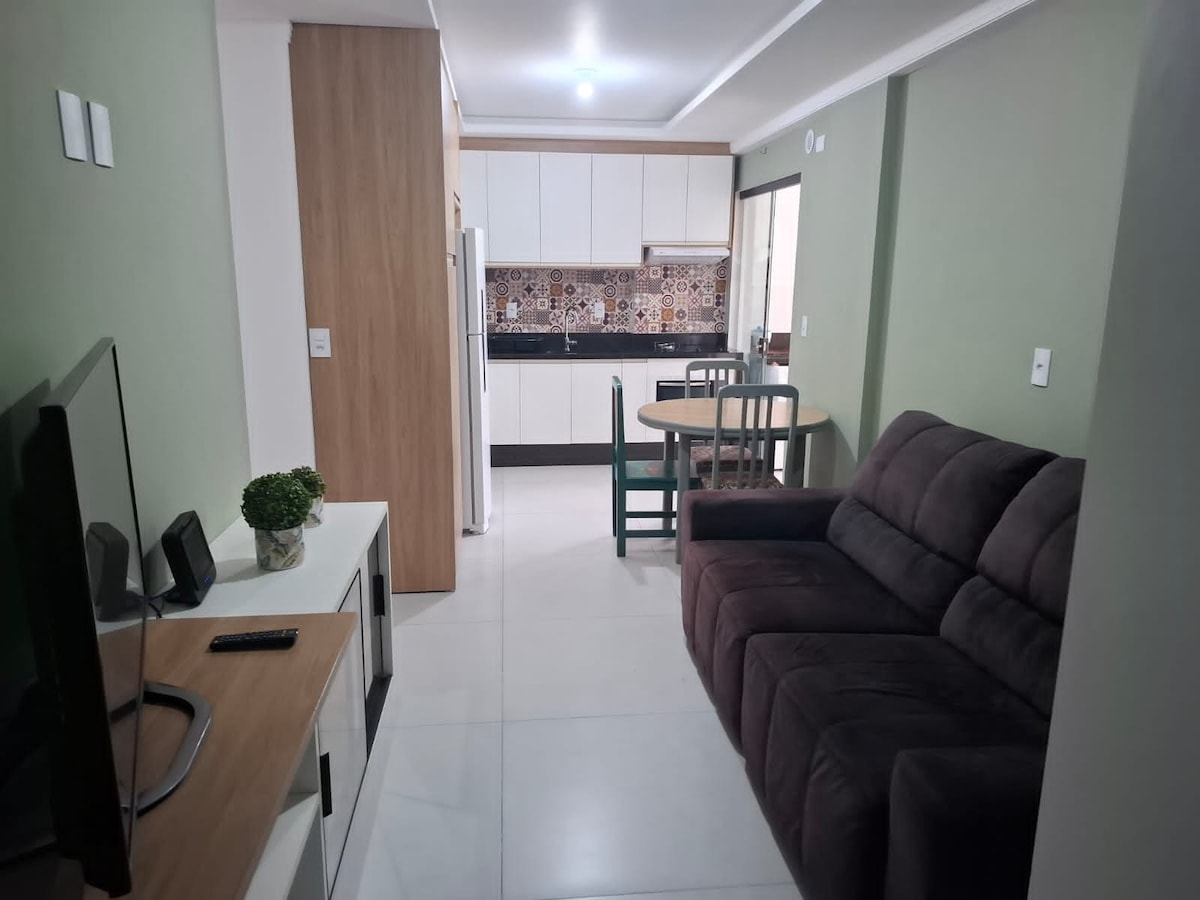 Apto aconchegante acolhedor para quem viaja em família. Todo mobiliado, 2 andar, 1 quarto cama de casal ar/TV, outro com uma cama de casal, 1 cama solteiro com sobrepor e ar , sala cozinha, banheiro, sacada com churrasqueira, 1 vaga de garagem. Apto com tela de segurança em todas as aberturas. Situado a 200 metros do Beto carreiro podendo ir a pé. 20 min. Aeroporto Navegantes, próximo mercados e padarias. Venha desfrutar das maravilhas SC com família e amigos Beto Carrero World
