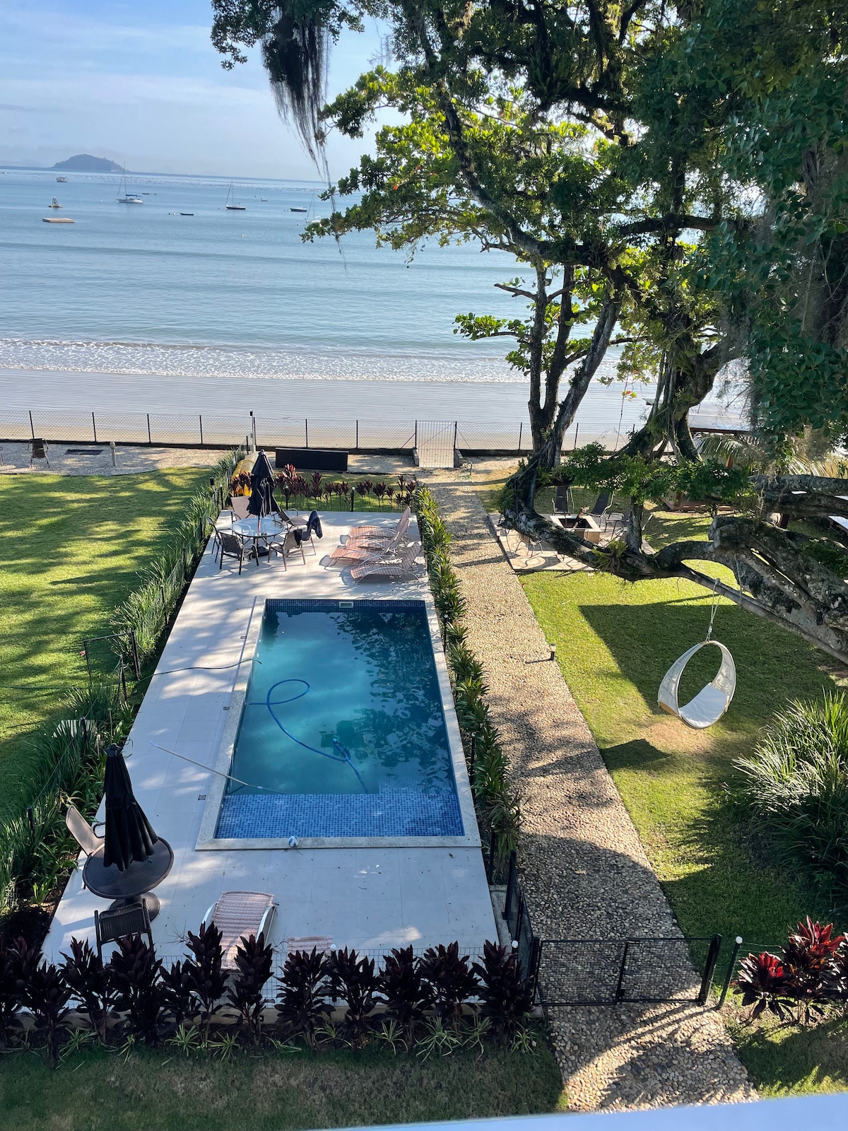 Sol da manhã, linda vista, praia, parque e piscina