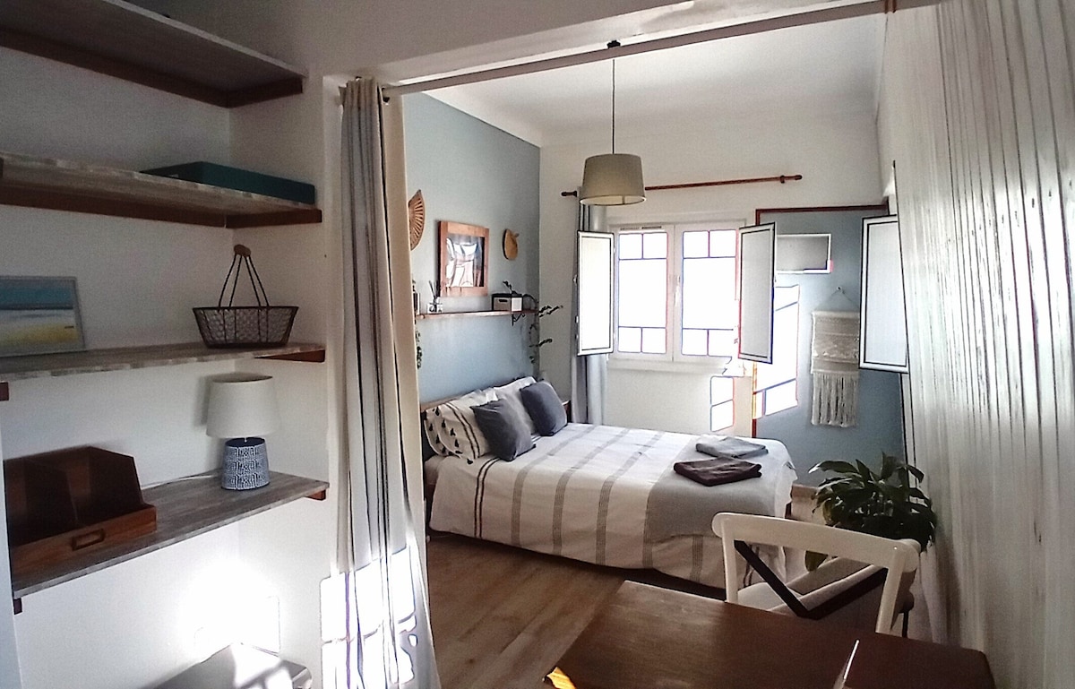 Newly renovated studio on 1st floor of guest house. Lots of sunlight, cosy and comfortable, view over the patio, facing south. Equipped kitchen (private). There is a wardrobe & storage in the corridor. Private bathroom. Access to communal beautiful backyard with lots of space, tables and palette sofas. The house hosts short term holiday guests as well as long term digital nomads from all nationalities!