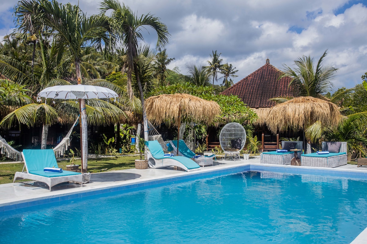 Stay in the heart of Nusa Penida, secluded within Bali's bird conservation, with flocks of birds singing over you! & surrounded by 100-year-old trees! Enjoy your stay in a unique-charming room with a pool, & outdoor-indoor shower! Only 200m from Nusa Penida's most famous area of restaurants, bars, and beach clubs & dive centers! Only a few walking distances to a pristine beach overlooking Mount Agung with beautiful coral scenery perfect for diving & snorkeling.