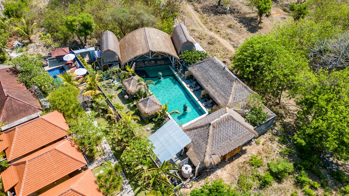 Stay in the heart of Nusa Penida, secluded within Bali's bird conservation, with flocks of birds singing over you! & surrounded by 100-year-old trees! Enjoy your stay in a unique-charming room with a pool, & outdoor-indoor shower! Only 200m from Nusa Penida's most famous area of restaurants, bars, and beach clubs & dive centers! Only a few walking distances to a pristine beach overlooking Mount Agung with beautiful coral scenery perfect for diving & snorkeling.