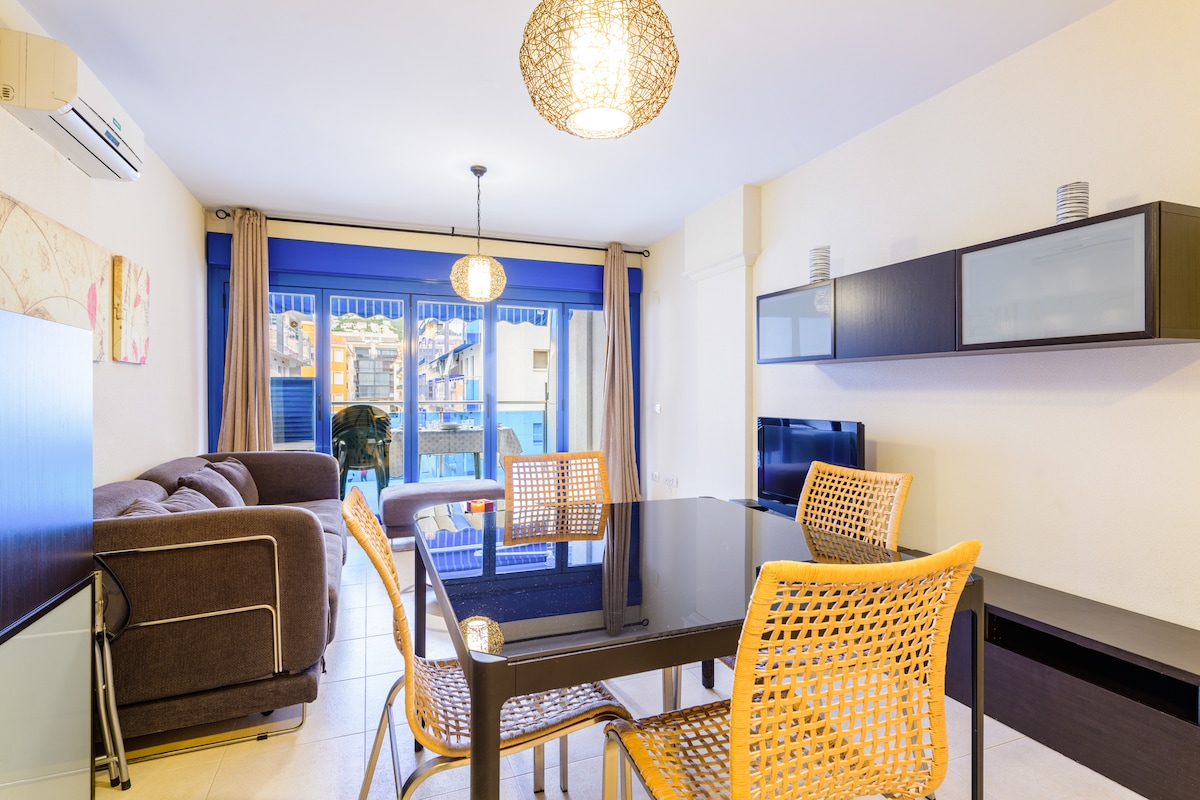 Maravilloso apartamento de estilo minimalista con unas espectaculares vistas al mar, consta de 2 habitaciones, 2 sofás cama, cocina, comedor, sala de estar, 2 terrazas, vistas al mar desde todas las habitaciones, piscina, garaje privado y cerrado donde podrá guardar su coche, bicicletas, Wi-Fi,etc... Está en una zona muy tranquila y de las mas exclusivas de la ciudad. La distancia al centro de Peñiscola es de 800 metros y la distancia a la playa esta a una distancia de 500 metros